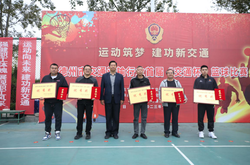 闭幕式开始前,首届“交通杯”篮球赛最后一场比赛暨总冠军争夺战激情开赛。强悍的身体对抗、高超的过人技术、巧妙的传球方式、娴熟的战术配合、高速的攻防转换引来全场沸腾,队员们的精彩发挥为现场观众带来一场震撼的巅峰对决。最终,经过7天共32场比赛的激烈角逐,德州市交通运输投资发展集团成功问鼎冠军,禹城市交通运输局和德州市公路事业发展中心分别荣获亚军和季军。