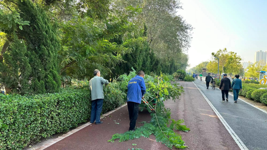 组织人员根据苗木习性和景观效果,对枯死枝、病虫枝、下垂枝等进行适当修剪,对面积较大、地面平整的草坪进行修剪,保持良好的景观效果。通过科学修剪,可有效调节植物营养物质分配,抑制植物发生徒长,为植物安全过冬、健康生长提供保障。