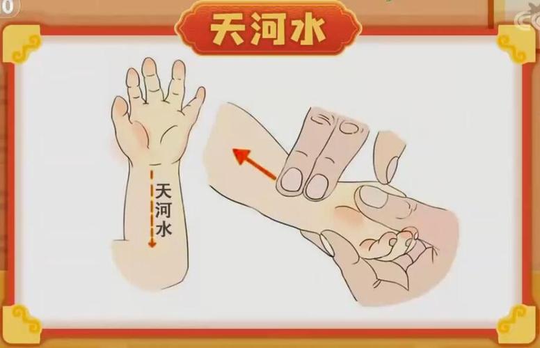 1、 发热期:当孩子出现发热的时候,家长首先要保证自己的情绪稳定,仔细观察孩子表现。记录孩子的症状表现,以及孩子手脚的温度,大小便的情况,精神的状态,出汗的程度,以方便就诊时告知医生。同时,一定要让孩子频频少量饮水、多排尿、饮食清淡、多睡觉是关键。孩子发热时可以在家给孩子多做清天河水(小儿推拿方法名),每次500下,最好能做到孩子皮肤微微发红,甚至少许出痧效果最佳。