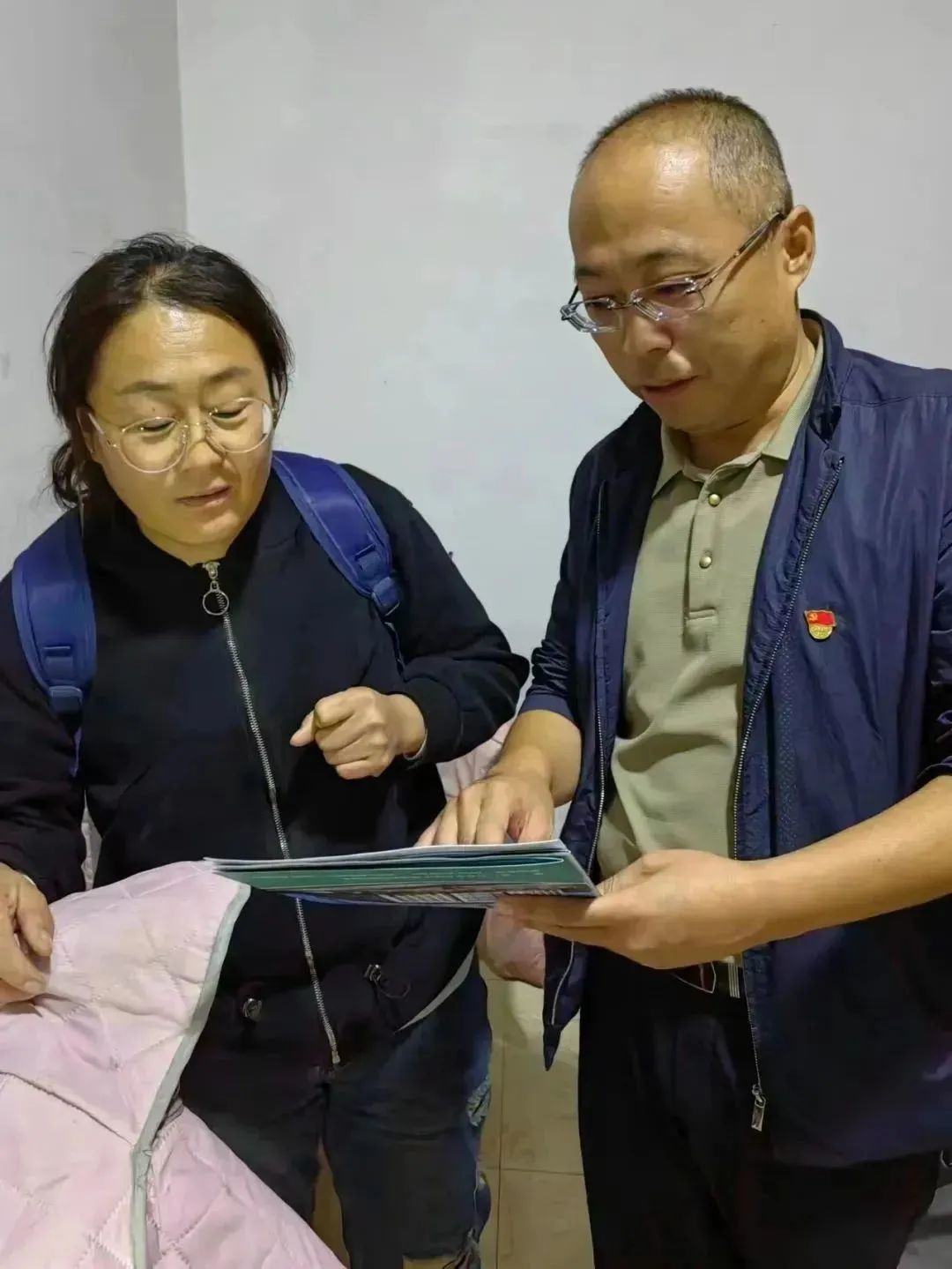医护人员为居民发放乐陵市中医院“专家群众连心桥”宣传页,公示联系电话,群众可第一时间与医院专家联系,解决其健康需求。