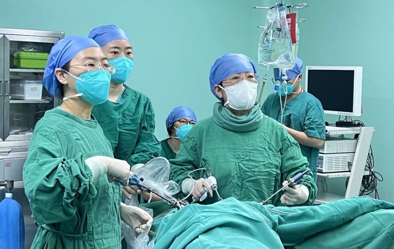 杨贵霞(右二)带领团队实施腹腔镜手术