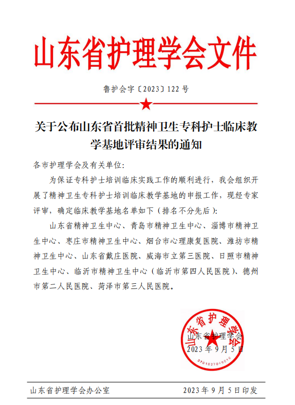 今年6月,根据山东省护理学会关于申报山东省精神卫生专科护士临床教学基地的通知要求,医院积极组织申报工作,并经省级专家组评审考察,成功获批山东省首批精神卫生专科护士临床教学基地。