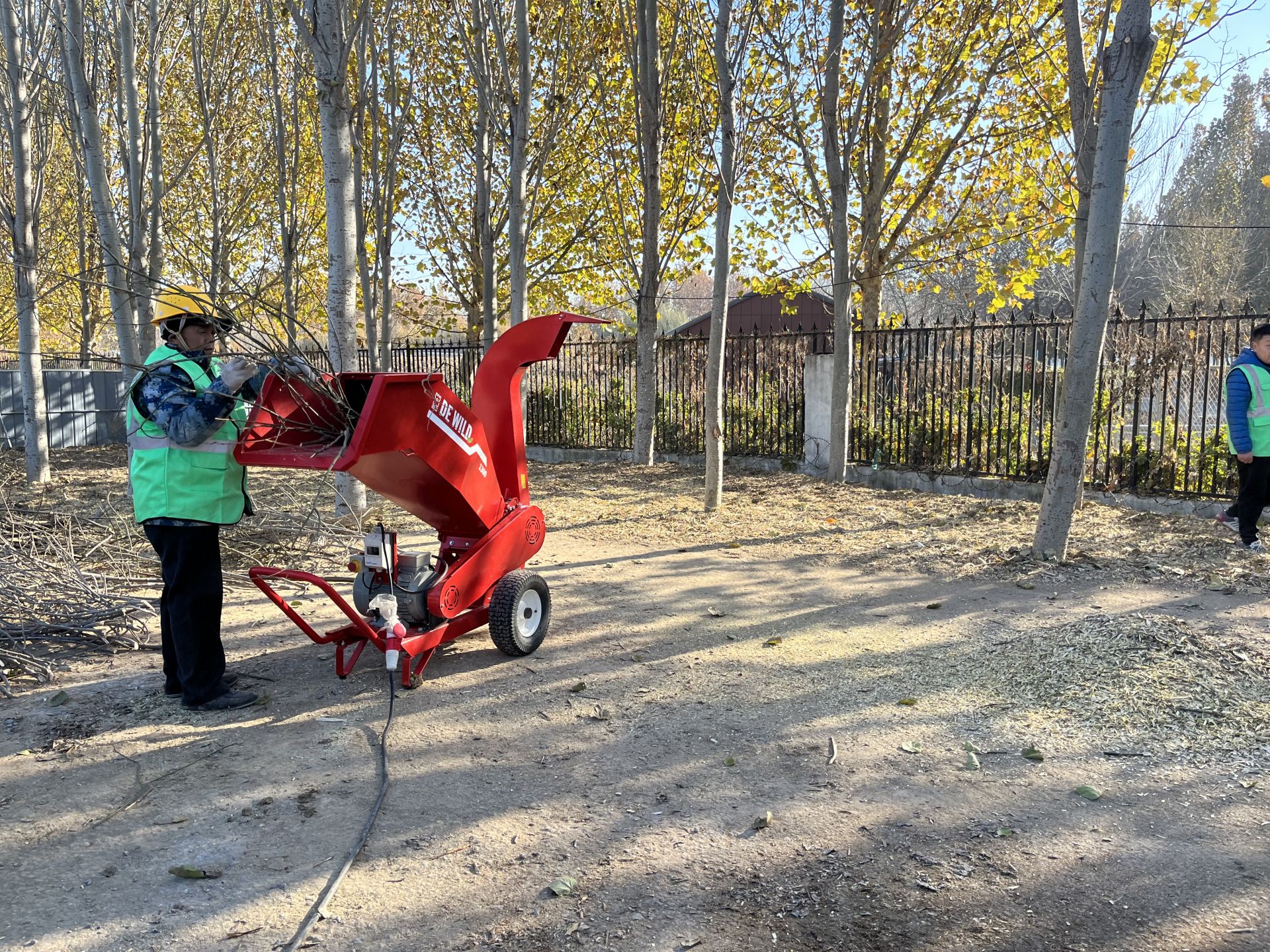 在位于德城区岔河东大道的园林绿化垃圾处置转运站,不时传出“卡啦啦”的响声。2名园林工人将一根根修剪下来的枝条,投入小型枝叶粉碎机中,很快,从机器的另一端,细碎的木屑慢慢涌出。