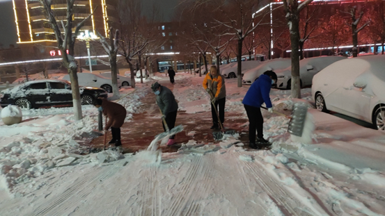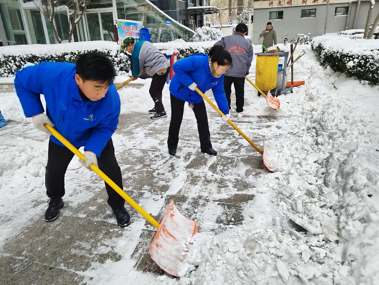 清晨6时许,佳居物业所有在管小区工作人员齐出,手持扫把、雪铲、铁锨、小拖车等工具,开展对小区内主路、单元门等区域积雪的清扫工作。由于降雪时间久,小区主路积雪经车辆压实后结冰,为清理工作增添难度,各项目员工齐心协力、逐步击破,直至上午11时,各小区小区主出入口、单元门口、主次干道、地库口等重要地段积雪已清扫完毕,路面无湿滑现象,降低了业主出行的安全隐患。