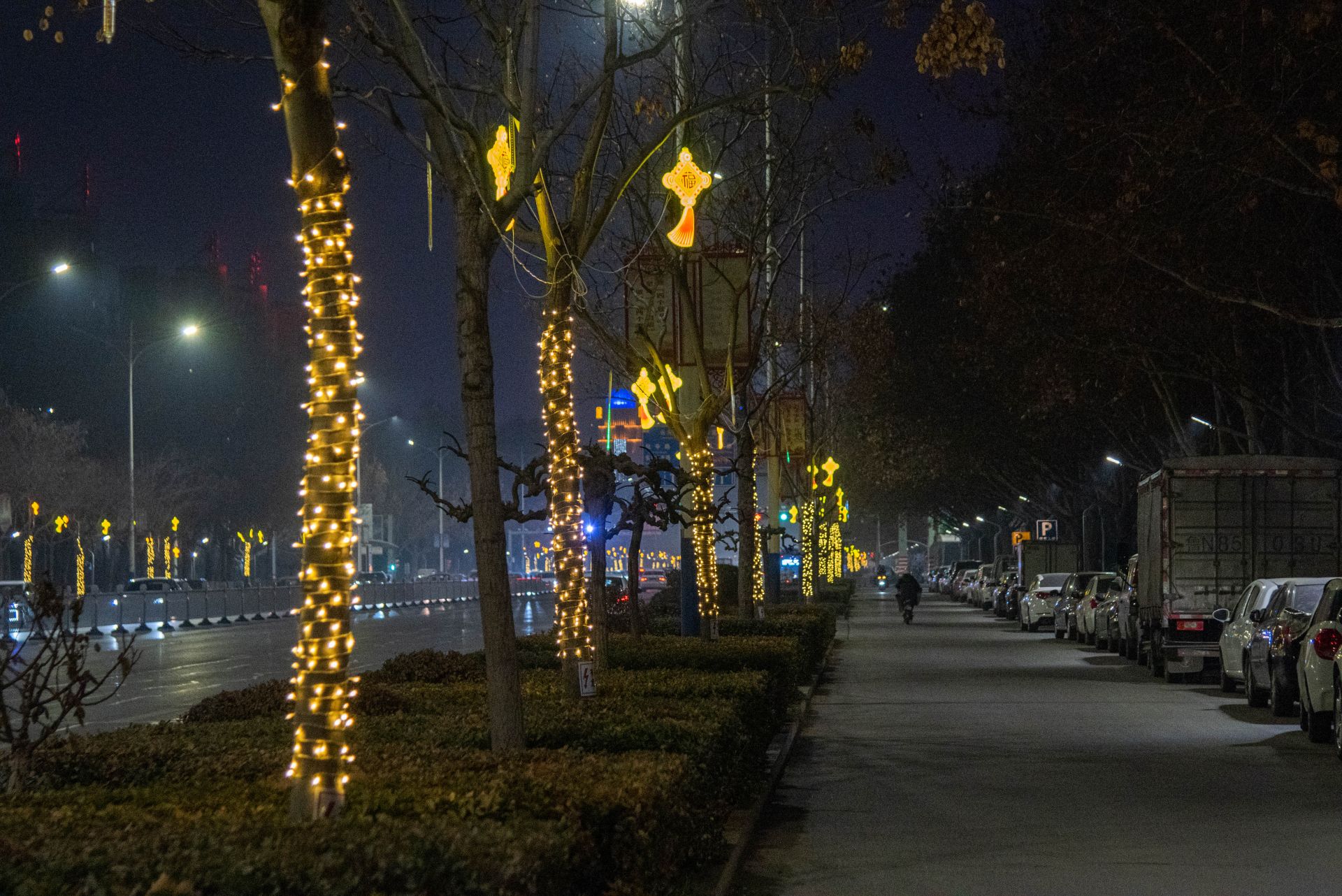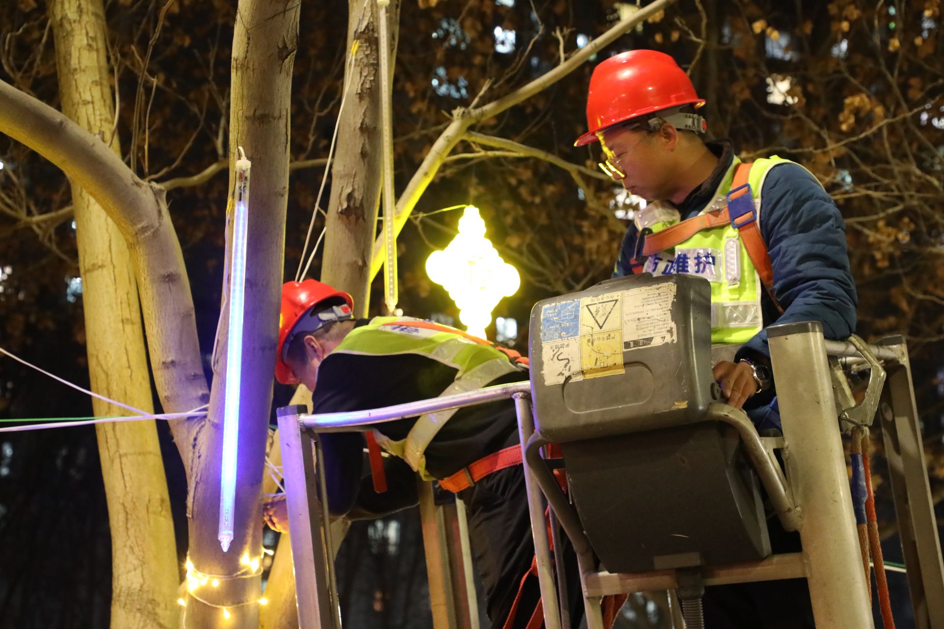 由于树上挂彩灯工序比较繁琐,需要在保护树木的同时按顺序挂好彩灯,加之这些彩灯属于易损物品,在安装过程中,师傅们会尽可能保证不损坏的前提下,加快安装速度,确保早日让整条东风路都“亮起来”。