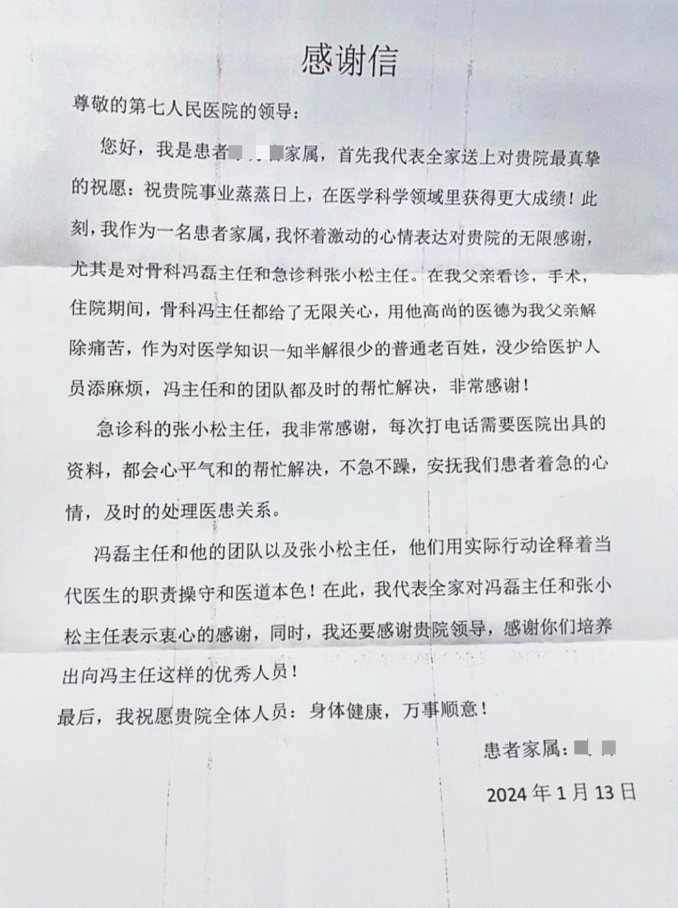近日,德州市第七人民医院收到一封来自患者家属的感谢信,洋洋洒洒数百字,书写着对医护人员的感激。