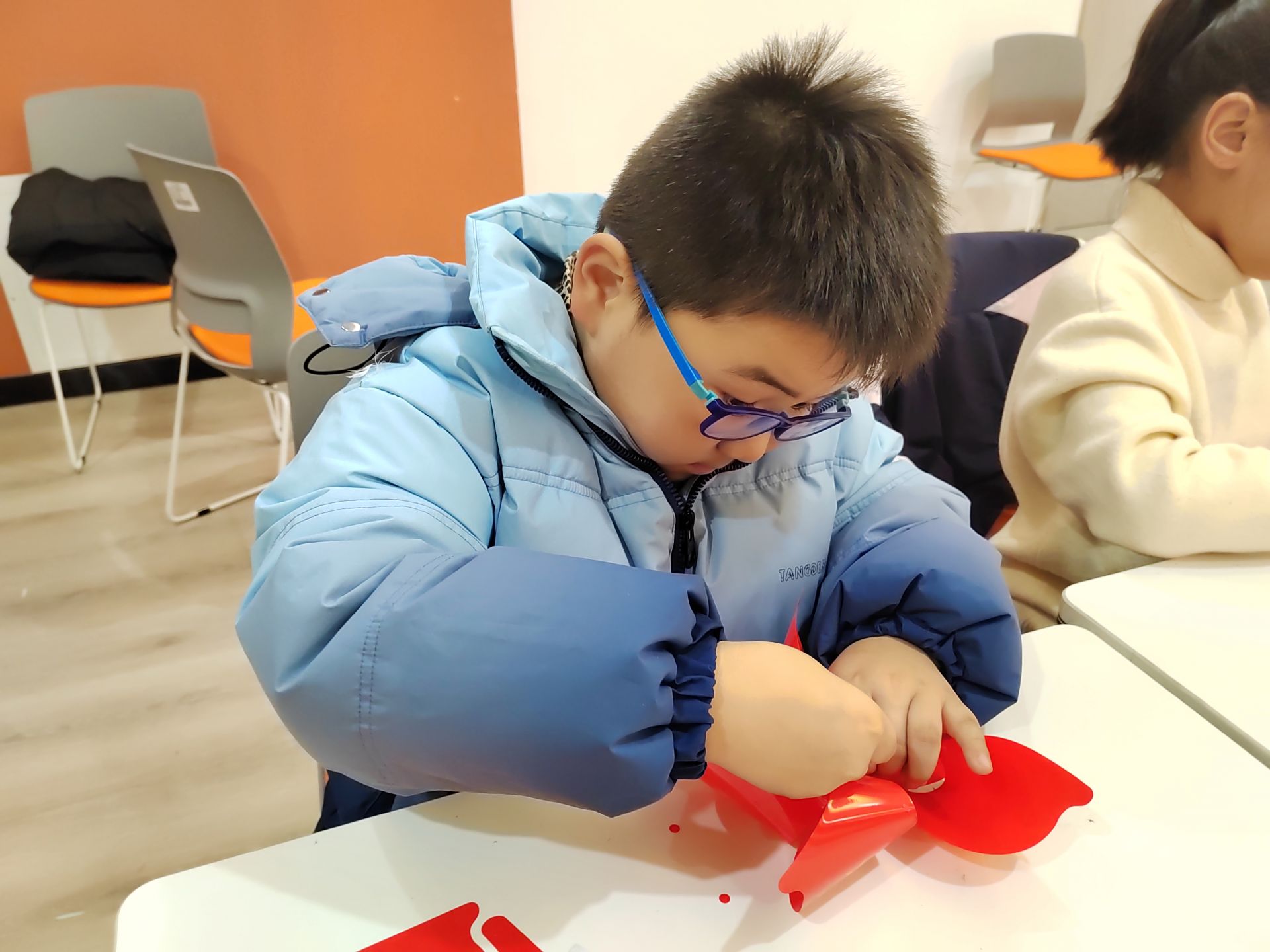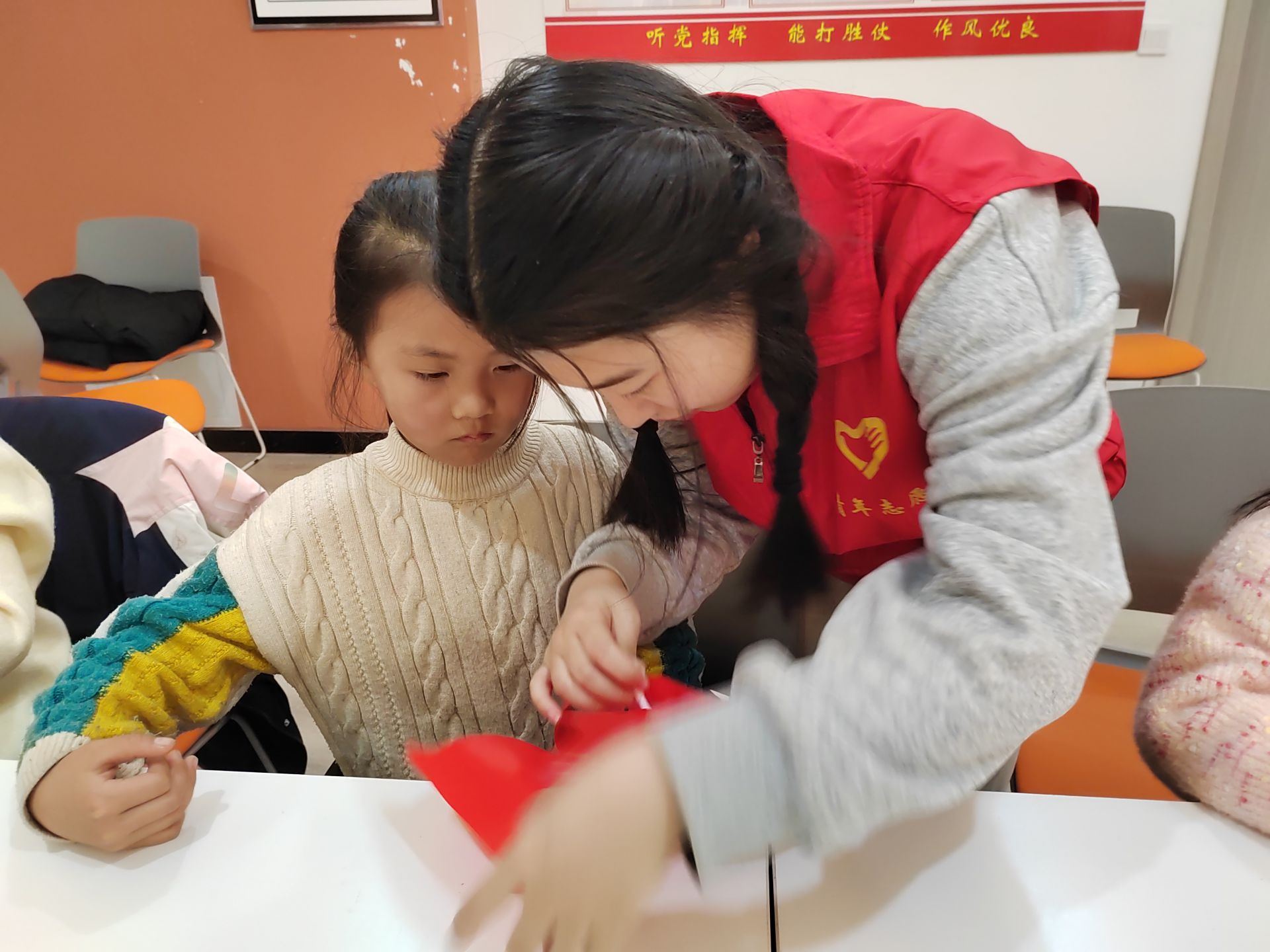 随后,活动进入了孩子们最期待的环节——趣味手工。社工将材料发放给每位孩子,并讲解制作方法和注意事项。在社工的辅助下,大家都制作出了带有“五星红旗”的风车,表达了孩子们对党、对祖国的热爱之情。