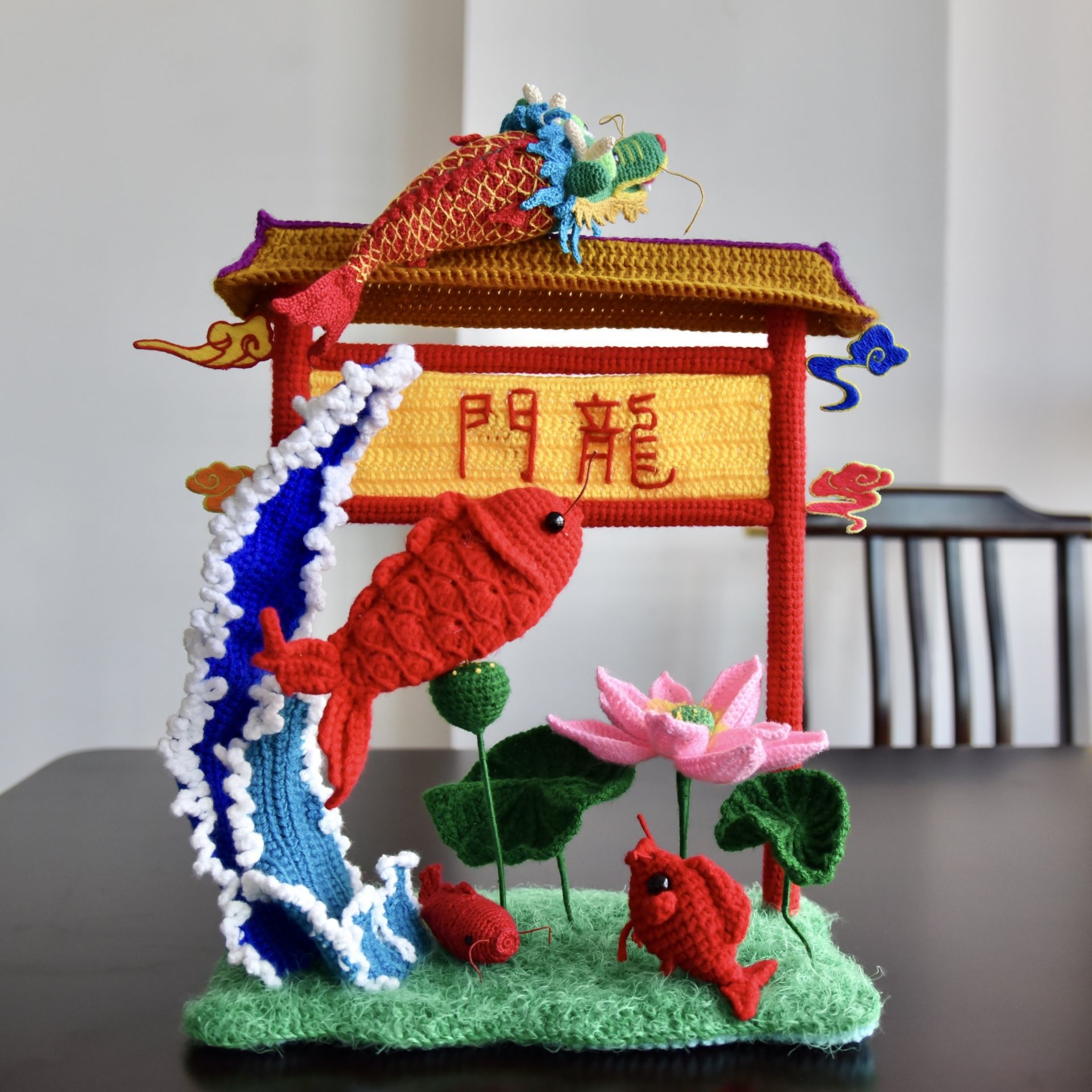“除了刺绣,我们还有编织作品嘞!”孙杰起身,从展柜里取出一件得意之作《鱼跃龙门》,这件作品包含龙门、水柱、鲤鱼、荷花等元素,使用不同颜色毛线编织而成,填充了珍珠棉,用纸、金属丝等材料固定,展示出一条鲤鱼奋力跃过龙门的瞬间——鱼头已变为龙首,未跃龙门的部分还是鱼身,将迎难而上、坚忍不拔展现得淋漓尽致。