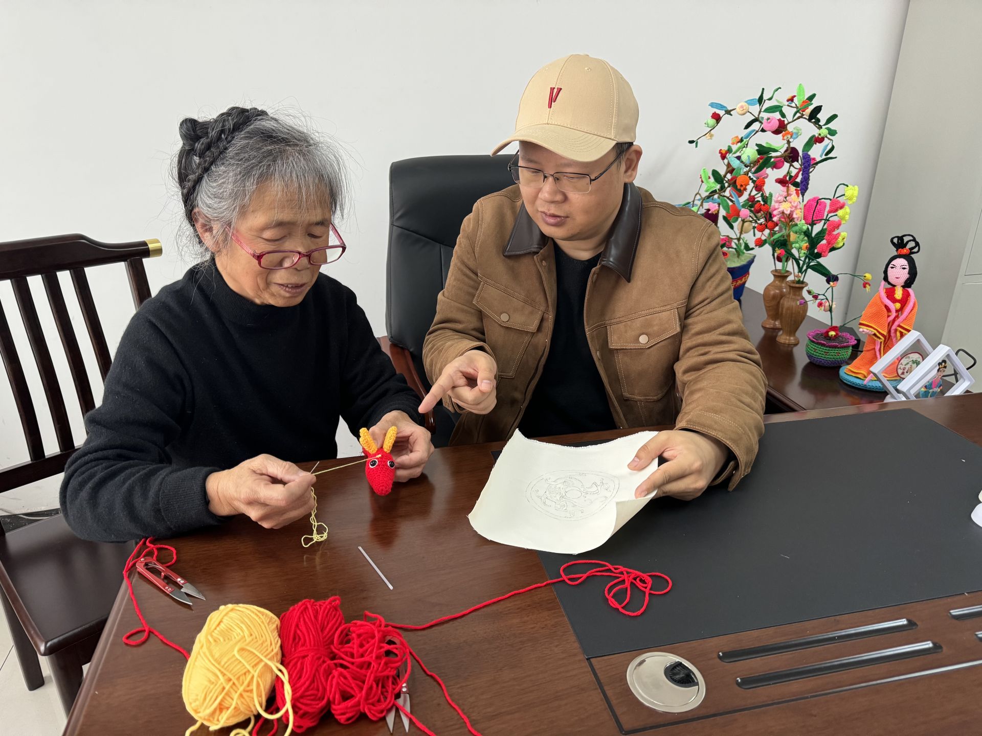 “我们沉醉在刺绣和编织技艺中,一直想办法将二者融为一体。” 李振奎指着桌上两个憨态可掬的北京冬奥会、冬残奥会吉祥物,面露自豪。吉祥物的主体为钩织,围脖为编织,冰墩墩的眼睛、雪容融的脸颊、头顶装饰和冬奥会、冬残奥会标志为刺绣,新颖美观,原件入选“冬奥圆梦 非遗传情——延庆(海淀)冬奥主题非遗展”,被延庆博物馆收藏。2023年,母子二人入选天衢新区非物质文化遗产项目代表性传承人。