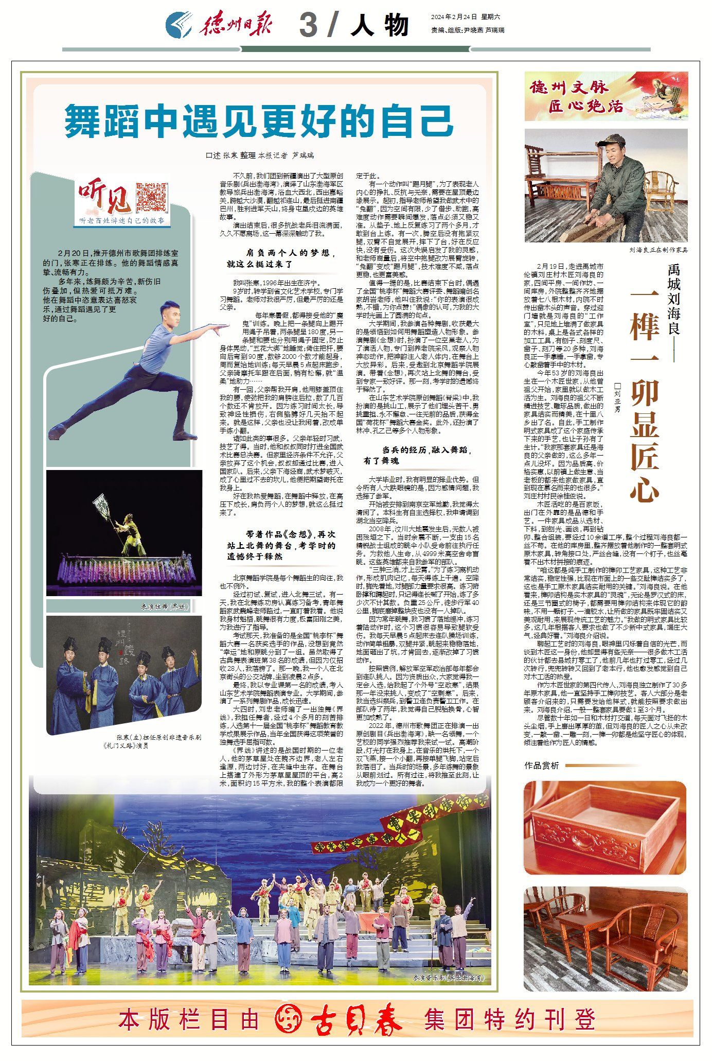2022年,德州市歌舞团正在排演一出原创剧目《兵出渤海湾》,缺一名领舞,一个艺校的同学强烈推荐我来试一试。高潮阶段,灯光打在我身上,在音乐的烘托下,一个双飞燕,接一个小翻,再接单腿飞脚,站定后我落泪了。当兵时的场景,多年练舞的景象从眼前划过。所有过往,将我推至此刻,让我成为一个更好的舞者。