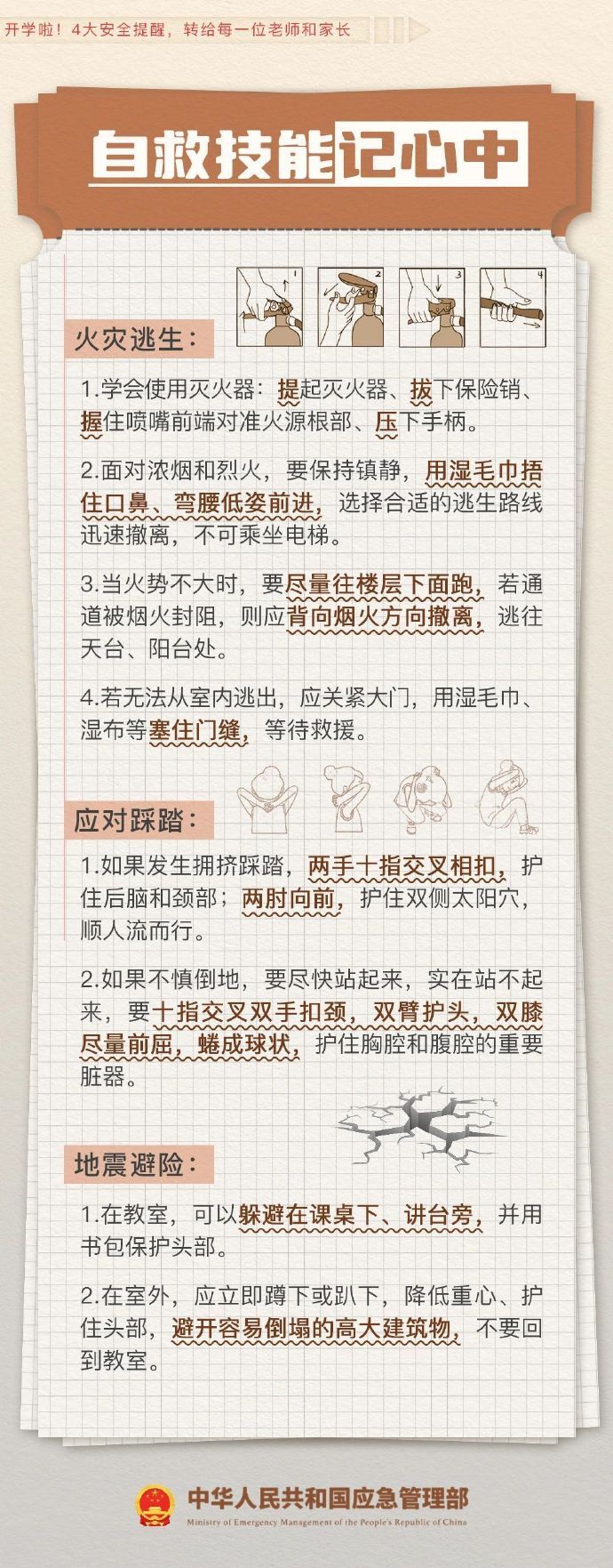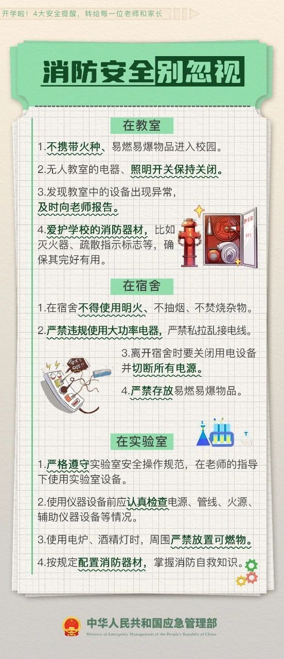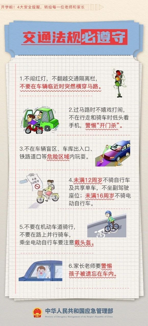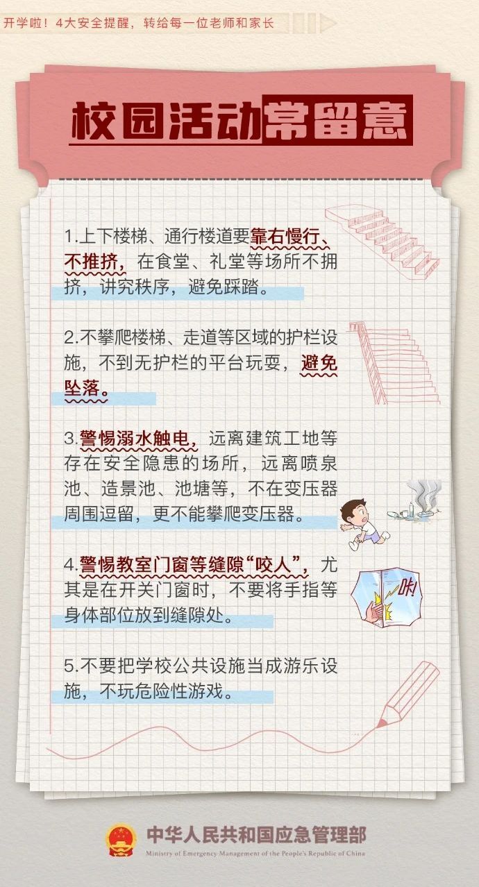 开学啦!4大安全提醒,一定要让孩子知道! 2024-03-01 15:09 应急管理部微博 0 开学安全提示来了!新学期的钟声响起,安全第一课你准备好了吗?日常学习生活如何避免危险?上下学路上要注意什么?……4大安全提醒,一定要让孩子知道!