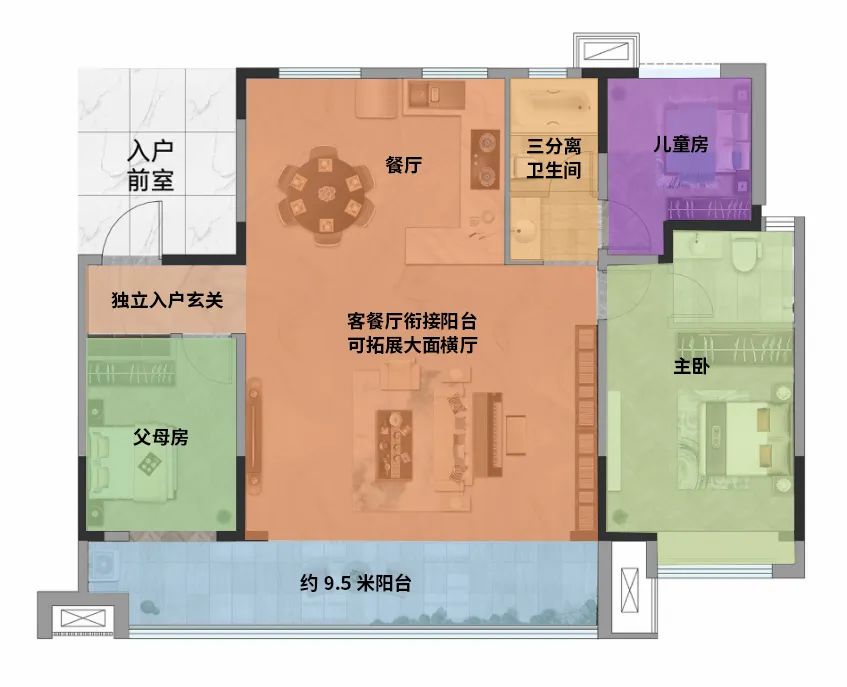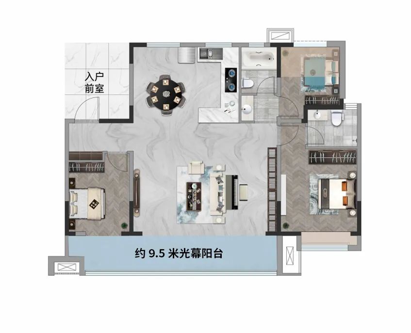 阳台作为整个居住空间内与阳光、微风接触最为“亲密”的区域,承载着尤为重要的功能分布。金辰·雲峯通过约9.5米的光幕阳台,实现了阳台实用性与美观性的双全。