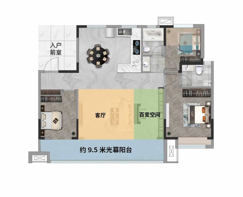 根据家庭的不同需求,可拓展空间既可打造为独立次卧或书房、茶室、影音室,满足多种多样的功能性,也可优化隔墙,将客厅、阳台与可拓展空间连通,打造约6.6米奢阔横厅。