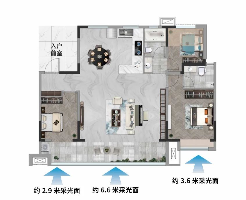极致的采光性与通透感,所带来的不只是舒适的体验,更是健康的生活。金辰·雲峯打造全明南向三开间,进深与面宽形成黄金比例,约13.1M巨幕采光面、约9.5M光幕阳台,均打造落地窗墙,最大化扩大采光面,成就了空间的极致通透性。