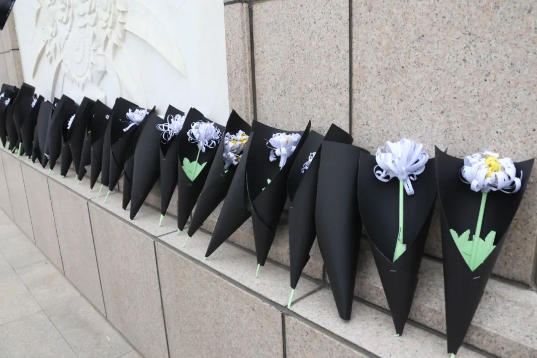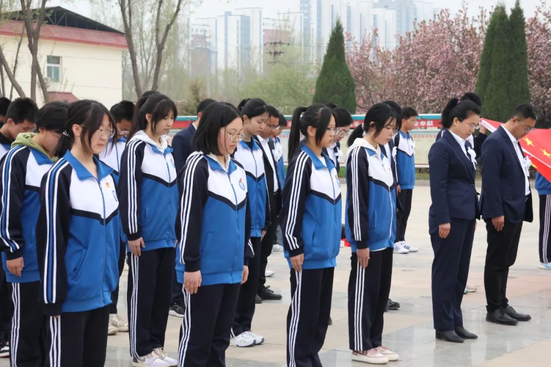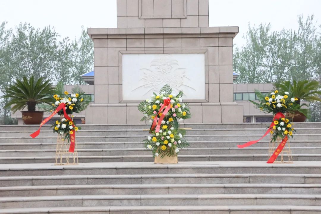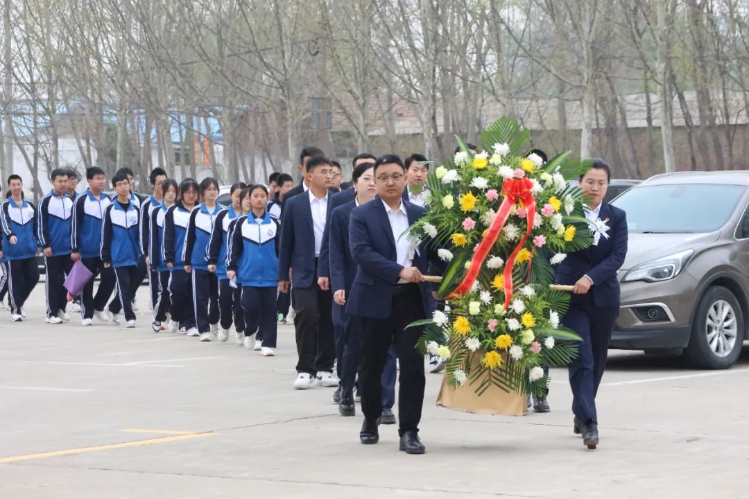 全体师生默哀鞠躬,并向烈士敬献花篮,追思英魂。