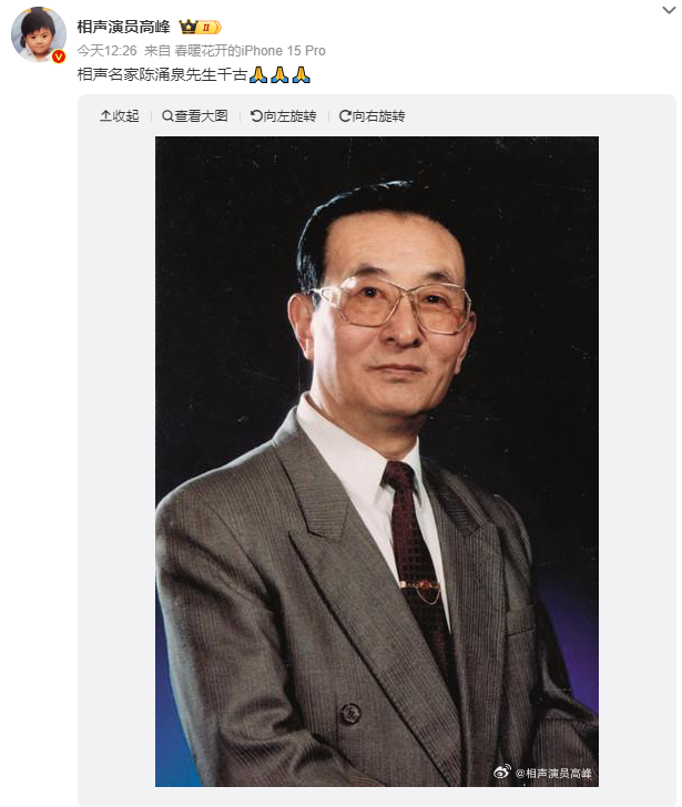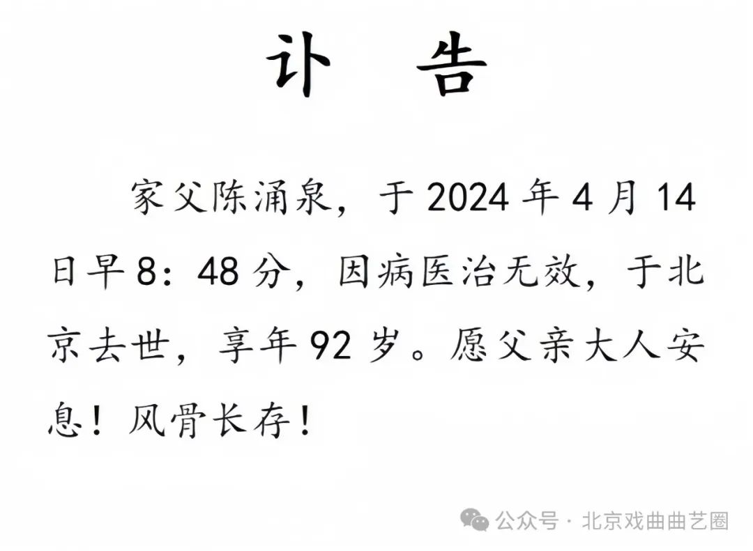 4月14日,北京曲艺团著名相声表演艺术家陈涌泉家人发布讣告,陈涌泉于2024年4月14日早8:48分,因病医治无效,于北京去世,享年92岁。