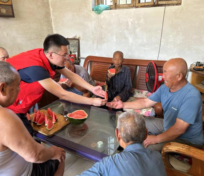 志愿者为老人们带去了西瓜等慰问品,并与老人唠家常,详细了解他们的身体状况和生活情况,耐心倾听其生活中遇到的困难和问题。