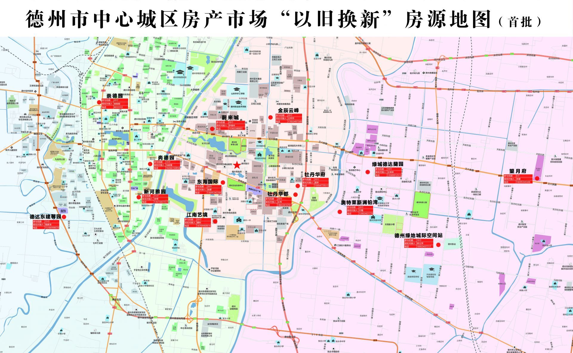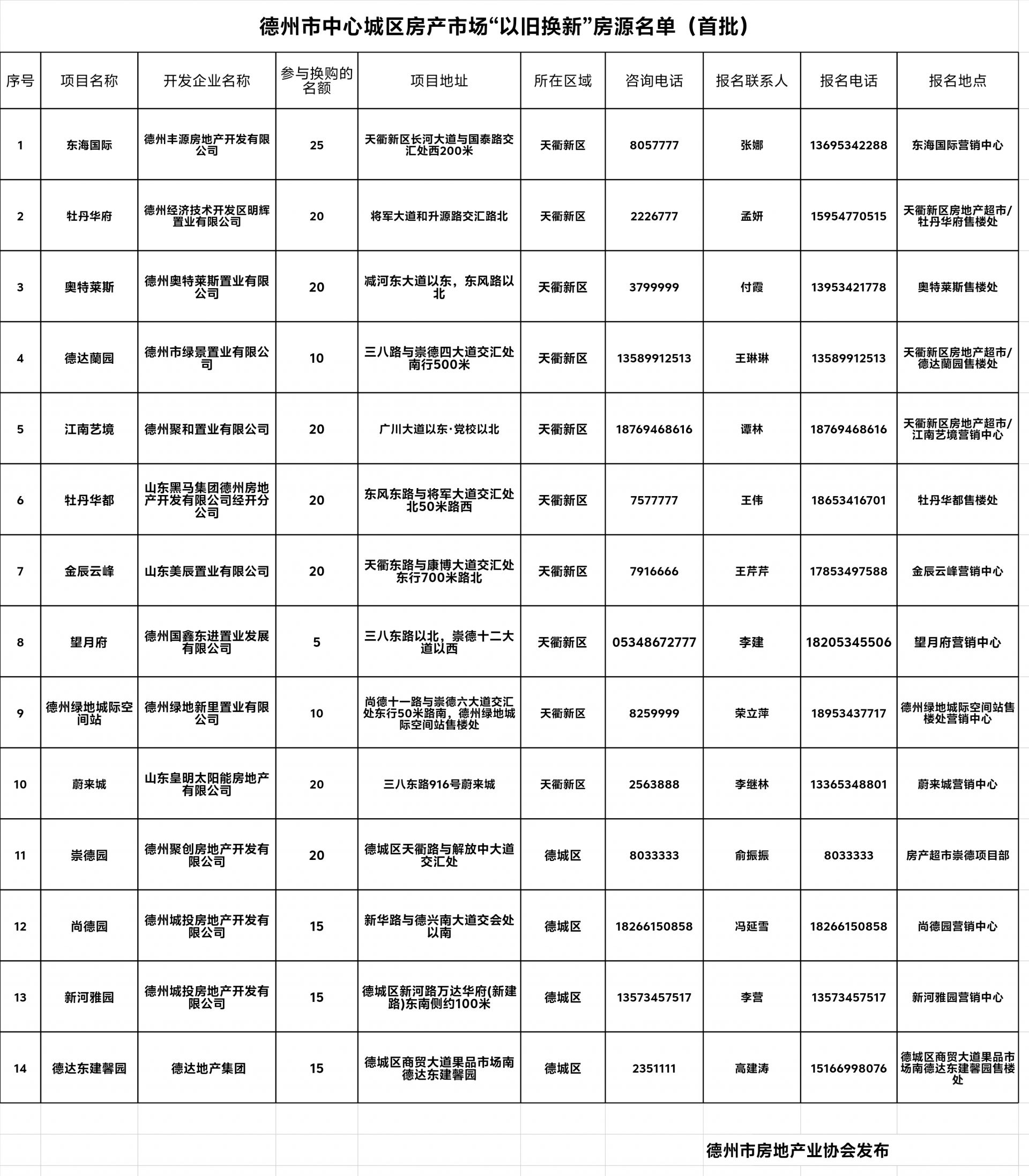 (一)房源发布。参与“以旧换新”活动的房地产开发企业和房源信息,由德州市房地产业协会通过德城区和天衢新区房产超市分批面向社会发布,包括楼盘名称、名额、报名方式、时间、地点等。