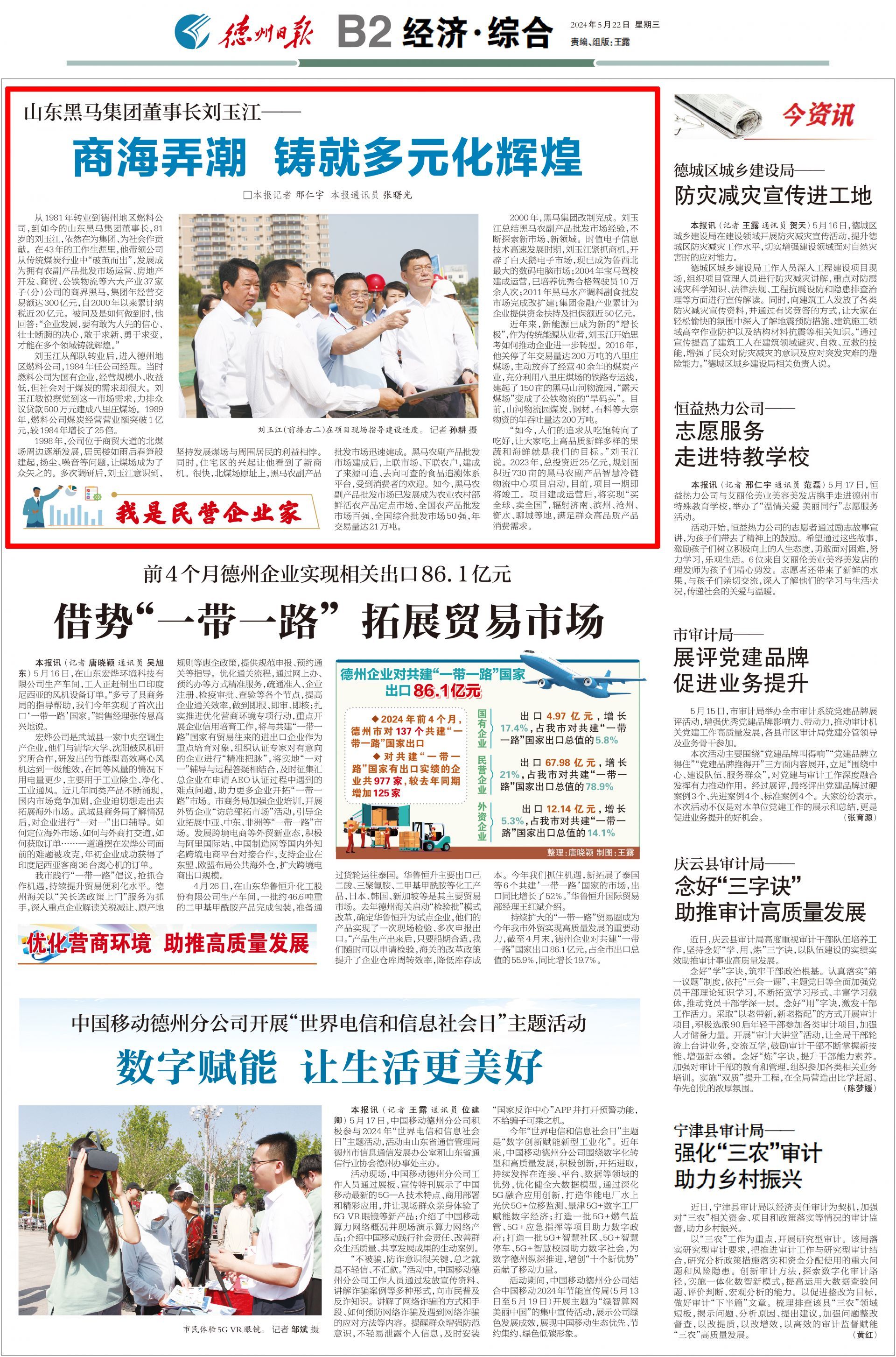 从1981年转业到德州地区燃料公司,到如今的山东黑马集团董事长,81岁的刘玉江,依然在为集团、为社会作贡献。在43年的工作生涯里,他带领公司从传统煤炭行业中“破茧而出”,发展成为拥有农副产品批发市场运营、房地产开发、商贸、公铁物流等六大产业37家子(分)公司的商界黑马,集团年经营交易额达300亿元,自2000年以来累计纳税近20亿元。被问及是如何做到时,他回答:“企业发展,要有敢为人先的信心、壮士断腕的决心,敢于求新、勇于求变,才能在多个领域铸就辉煌。”