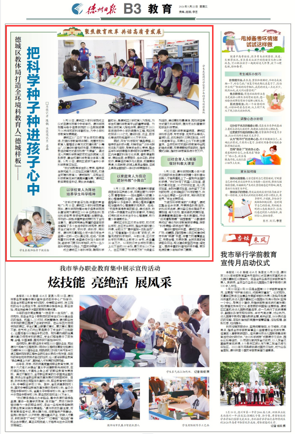 德城区以“三级”家长学校协调推进、打造科学教育师资梯队、完善家校科教育人管理体系等方式构建科教“小舞台”,以建设科普知识书屋、开展特色科教活动等方式做好科教“大课堂”。通过深入开展科学教育的家校社协同育人实践探索,融合构建科学教育立体育人框架。5月10日,德城区被评为省中小学科学教育实验区。