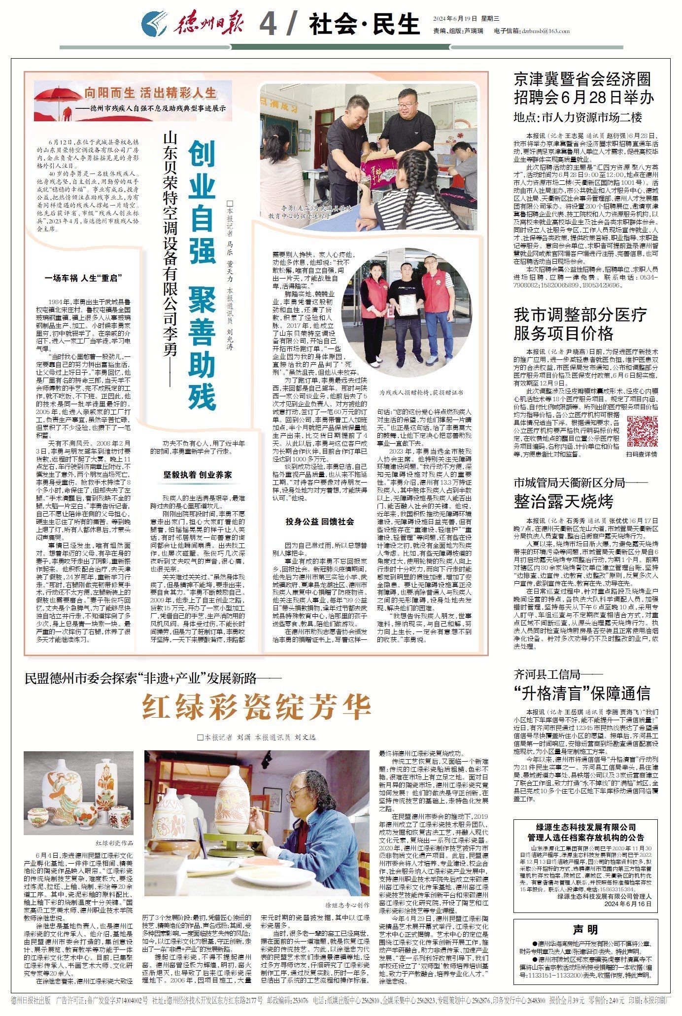 40岁的李勇是一名肢体残疾人。他身残志坚,自主创业,用勤劳的双手成就“稳稳的幸福”。事业有成后,投身公益,把热情倾注在助残事业上,为有着同样遭遇的残疾人撑起一片晴空。他先后获评省、市级“残疾人创业标兵”,2023年4月,当选德州市肢残人协会主席。