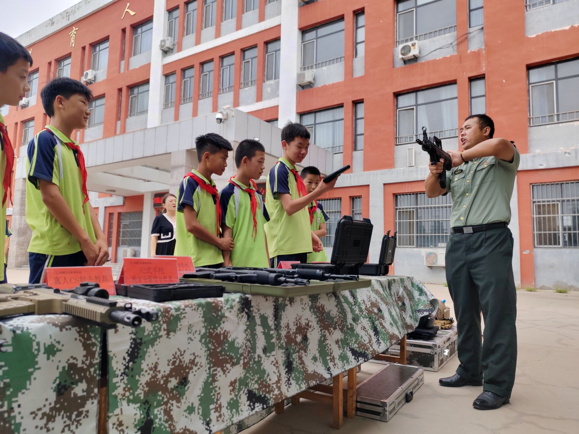 “立定!”“向前看齐!”随着教官们的一声声口号,孩子们在校园留下飒爽身姿。训练场上,教官们展示武器装备,学生们听得仔细、看得认真,而后纷纷轮番上阵,亲身体验装备性能。