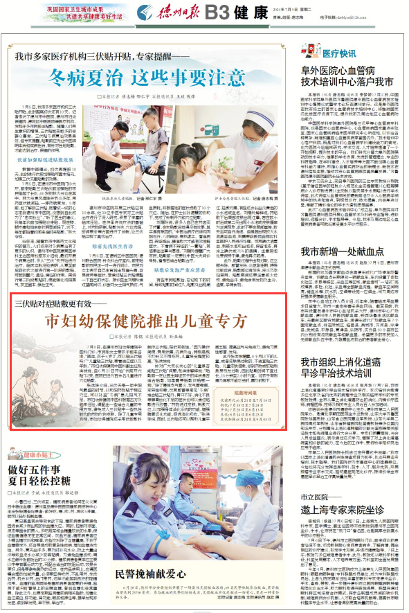 7月8日,在德州市妇幼保健院中医科门诊,市民张女士带孩子前来咨询,“医生,孩子5岁了,可以贴三伏贴吗?”“儿童贴三伏贴,要看适应症以及年龄。”市妇幼保健院中医科副主任张洪妹说,自6月21日开始“伏前开穴贴”以来,医院已经为百余名儿童进行穴位贴敷。