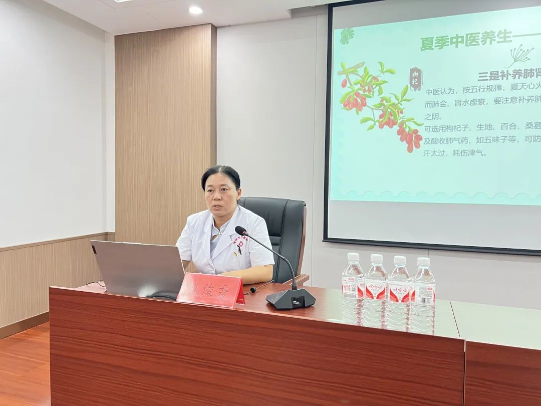 党员志愿者耿俊秀为公司员工讲解了《中医夏季养生》知识讲座,内容包括夏季常见疾病的预防和治疗及中医养生方法,如规律作息、适度运动、饮食调理等。城投公司工会将德州市中医院的养生茶饮酸梅汤作为消暑关怀福利分发给了员工,此茶饮由乌梅、山楂、陈皮、桂花组成,有清热解暑、生津止渴之效。