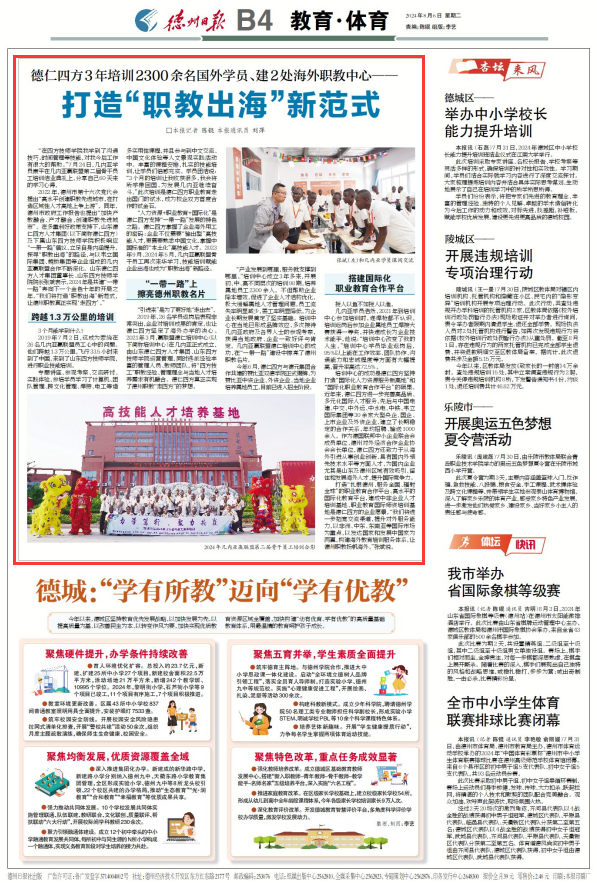 2022年,德州市第十六次党代会提出“高水平创建职教先进城市,在打造区域性人才高地上争上游”。同年,德州市政府工作报告也提出“加快产教融合、产才融合,创建职教先进城市”。在多重利好政策支持下,山东德仁四方人才集团(以下简称德仁四方)及下属山东四方技师学院积极响应“一带一路”倡议,立足自身内涵提升,探寻“职教出海”的路径,与以韦立国际集团、魏桥集团等企业组成的几内亚赢联盟合作不断深化。山东德仁四方人才集团董事长、山东四方技师学院院长张斌表示,2024年是共建“一带一路”奔向下一个金色十年的开局之年,“我们将打造‘职教出海’新范式,让德州职教真正实现‘走四方’。”