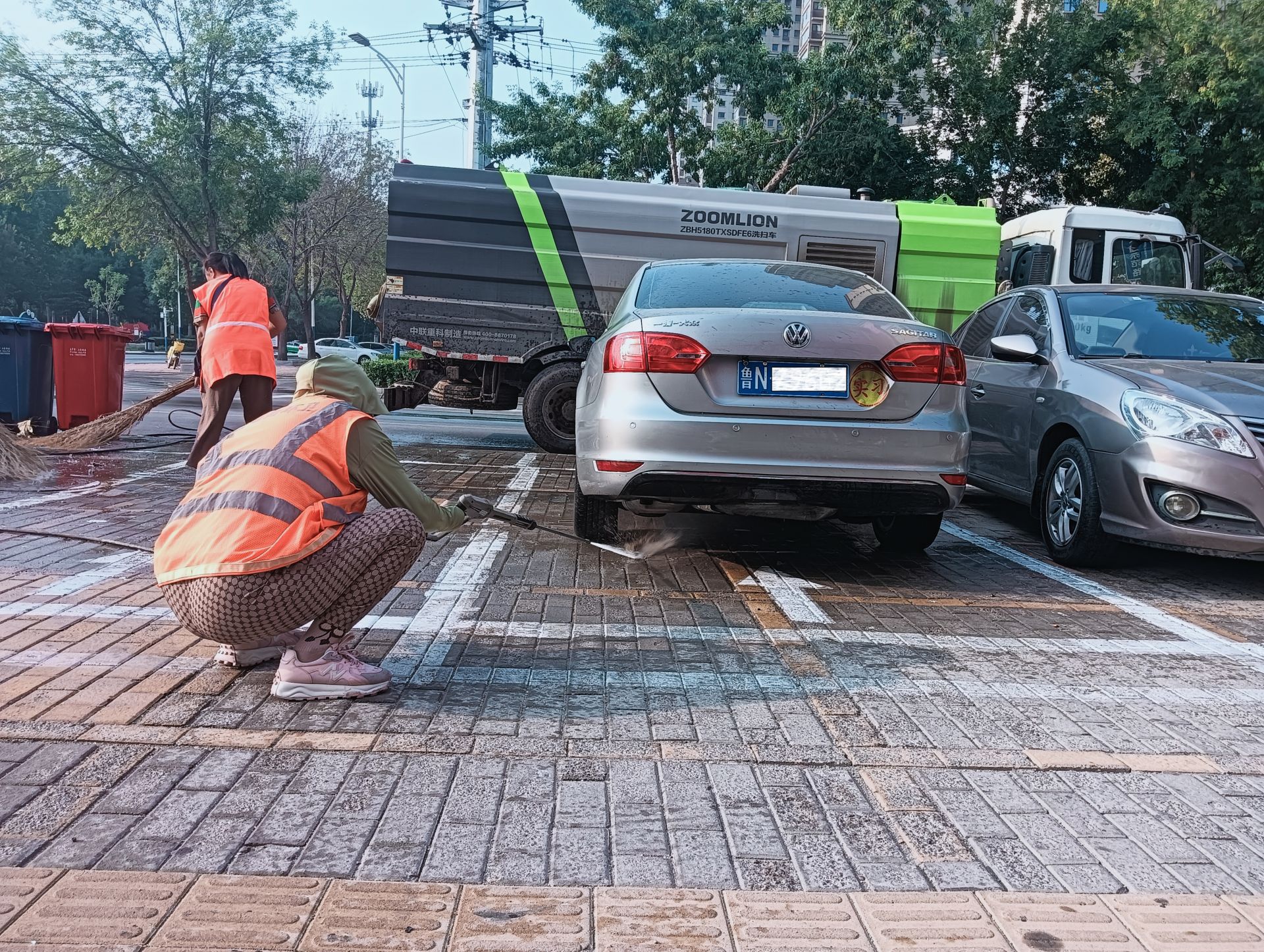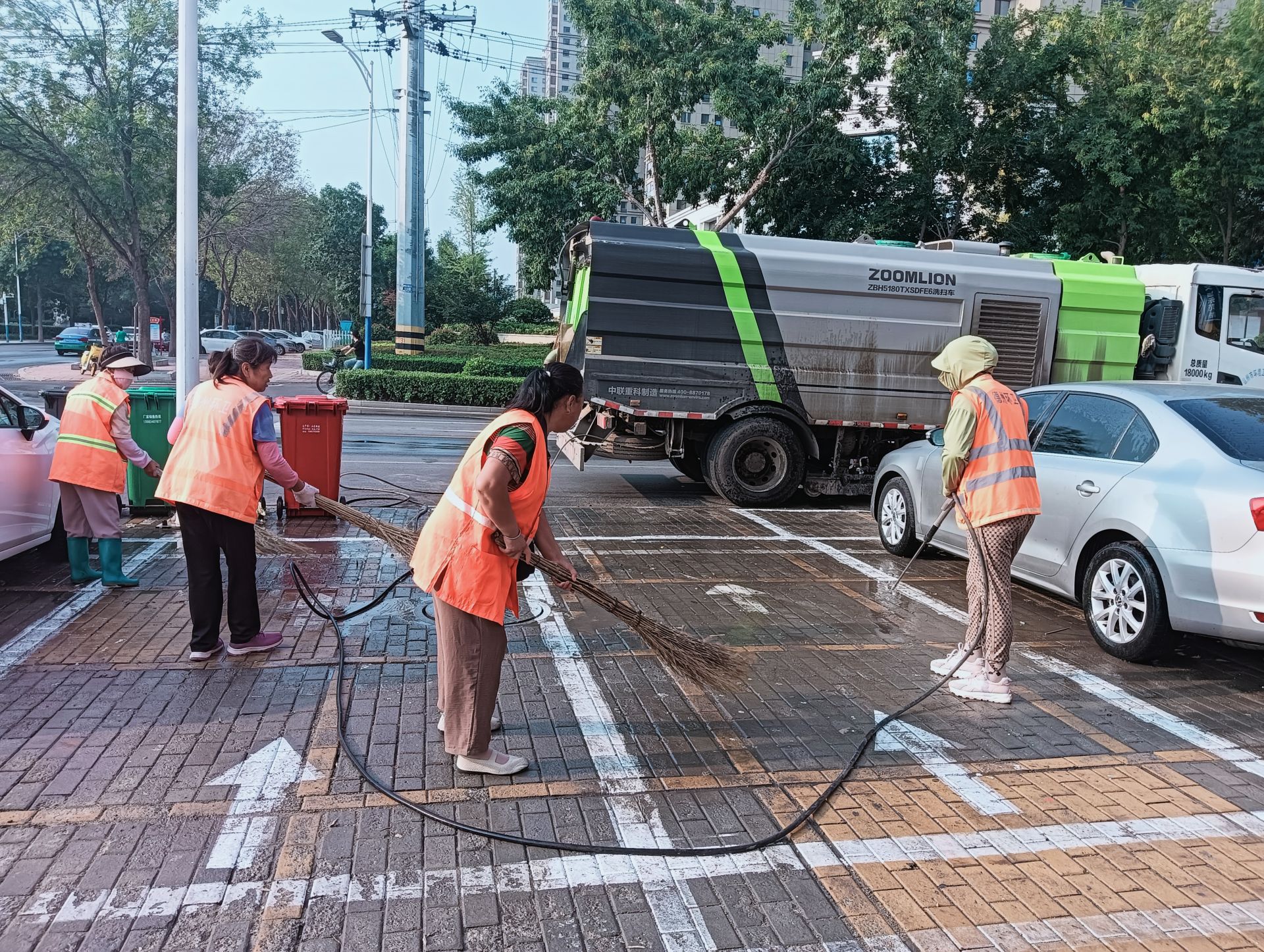 8月17日一早,在天衢新区常兴路,几名环卫工人正使用高压水枪冲洗道路公共停车位路面,随着水流强力冲刷,积尘被彻底清扫干净,路面呈现出“本色”。