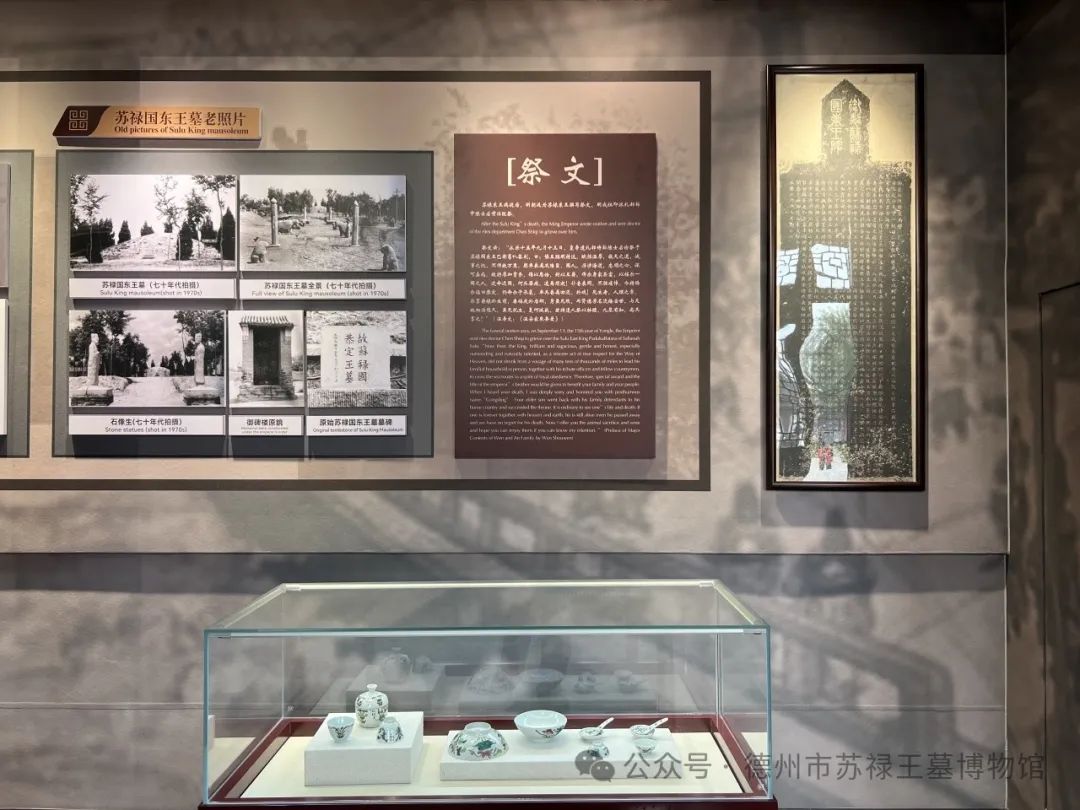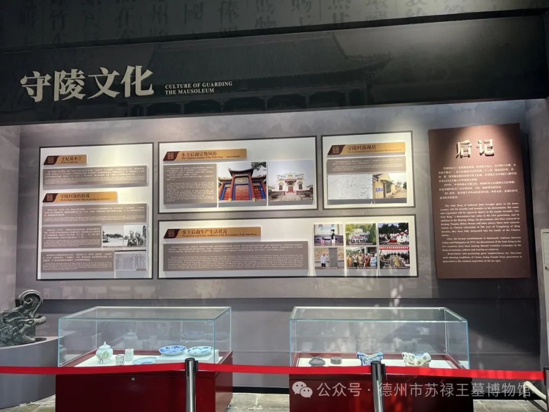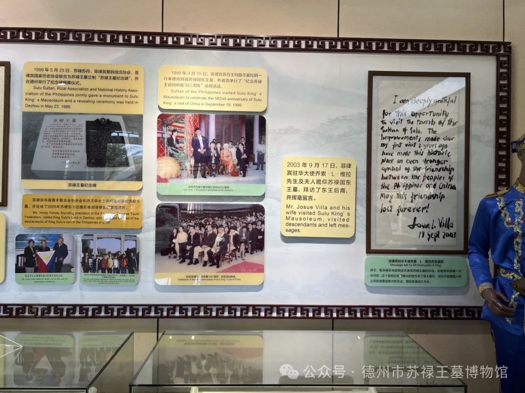 苏禄王墓距今已有600多年历史,承载着中菲友好交流的深厚历史底蕴。馆内通过“三殿一廊”的形式展现了苏禄王访华的这一伟大历史壮举。祾恩殿以苏禄国王访华背景、苏禄国简况、守陵文化为主题;西配殿以中菲友谊永续为主;东配殿展示了明清文人墨客游览苏禄王墓时所做的名诗佳作以及苏禄东王后人在德州历史上有突出作为的代表人物。