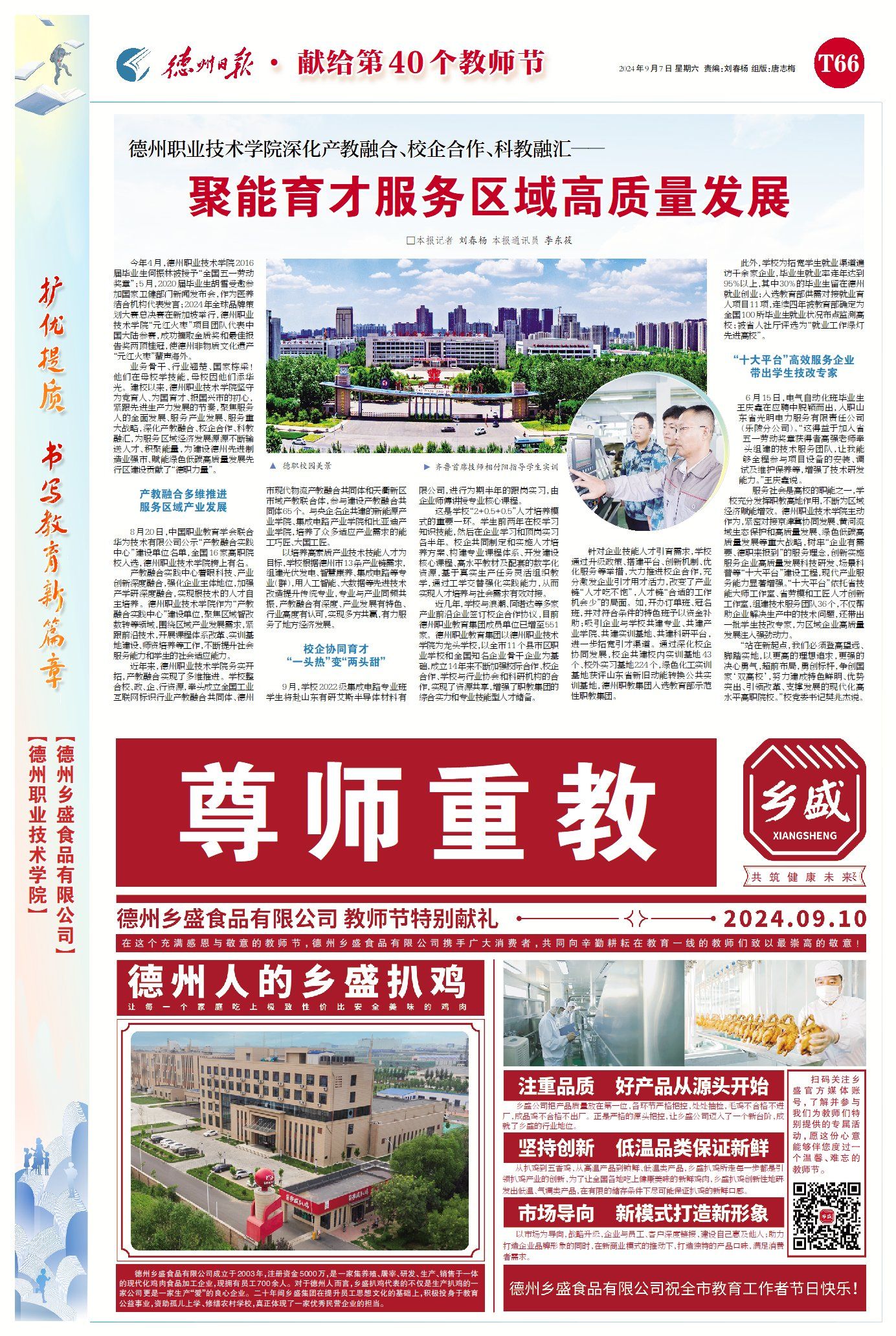 今年4月,德州职业技术学院2016届毕业生何振林被授予“全国五一劳动奖章”;5月,2020届毕业生胡雪受邀参加国家卫健部门新闻发布会,作为医养结合机构代表发言;2024年全球品牌策划大赛总决赛在新加坡举行,德州职业技术学院“元红火枣”项目团队代表中国大陆参赛,成功摘取金质奖和最佳报告奖两顶桂冠,使德州非物质文化遗产“元红火枣”蜚声海外。