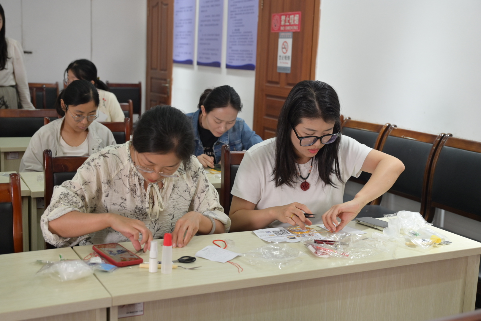 活动现场,志愿者首先为大家详细讲解了掐丝珐琅的制作流程、技巧要点及注意事项。大家根据自己的喜好,挑选喜欢的图案开始进行创作。绘图、掐丝、点蓝、封层,用金属勾勒轮廓,用釉料填充色彩。看似普通的金丝,在一番弯折处理后,构成一个个精巧细致的图案,搭配色彩鲜艳的釉料,呈现出意境美的同时,还展现出令人惊喜的立体艺术效果。基层干部们通过亲手制作切身感受到了精益求精的工匠精神以及投身劳动的成就感,进一步感悟了优秀传统文化的魅力,增强了民族自信。