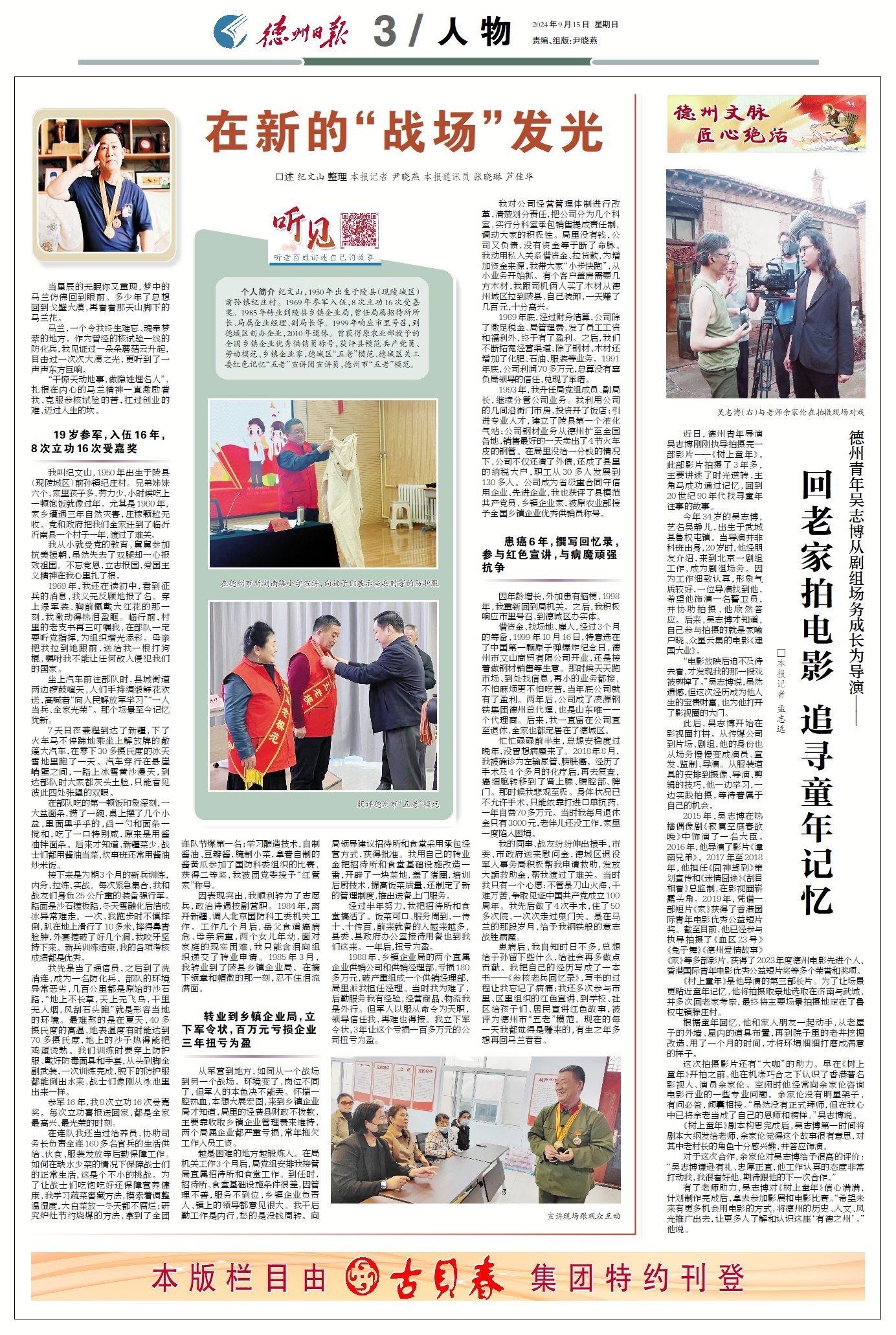 个人简介 纪文山,1950年出生于陵城区前孙镇纪庄村。1969年参军入伍,8次立功16次受嘉奖。1985年转业到原陵县乡镇企业局,曾任局属招待所所长、局属企业经理、副局长等。1999年响应市里号召,到德城区创办企业,2010年退休。曾获得原农业部授予的全国乡镇企业优秀供销员称号,获评县模范共产党员、劳动模范、乡镇企业家,德城区“五老”模范、德城区关工委红色记忆“五老”宣讲团宣讲员,德州市“五老”模范。