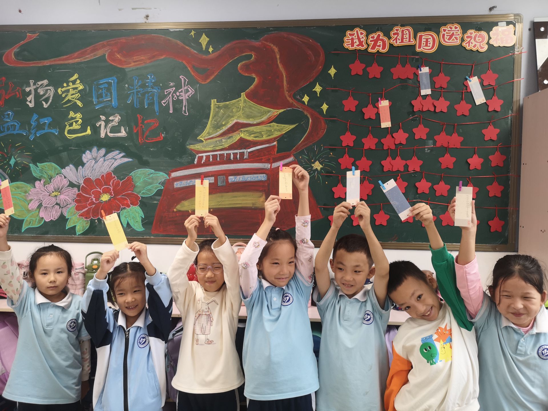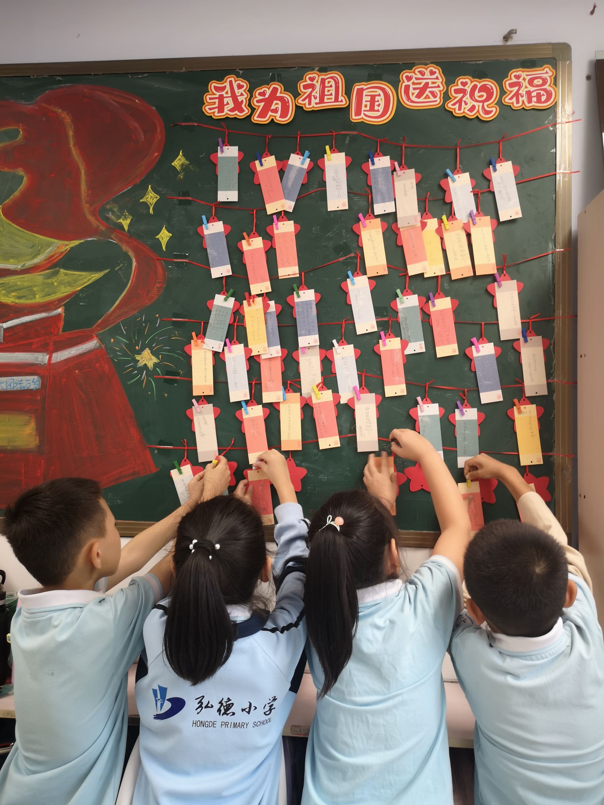9月30日,德州天衢新区弘德小学开展“我为祖国送祝福”活动。通过主题班会让学生们更加了解国庆节的相关知识,组织学生每人为祖国送一句祝福,写在书签上,并亲手挂在祝福栏,共祝祖国生日快乐。