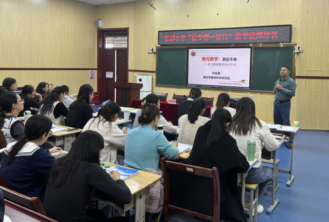 “老师们需要树立自己的单元教学世界观,从大到小,以点带面地进行教学。”10月19日,在德州天衢新区弘德小学的月度教研会上,山东省教学能手、来自潍坊市教科院的课程研究科科长孙俊勇以《单元教学:其实不难——单元整体教学的世界观》为题,深入浅出地讲解新课程标准理念的核心要义和实践要求。他通过生动的案例分析和实用的教学策略,帮助教师们掌握如何在课堂教学中实现教学目标、教学内容、教学方法和教学评价的一致性,进一步提升教学质量和学生学习效果。