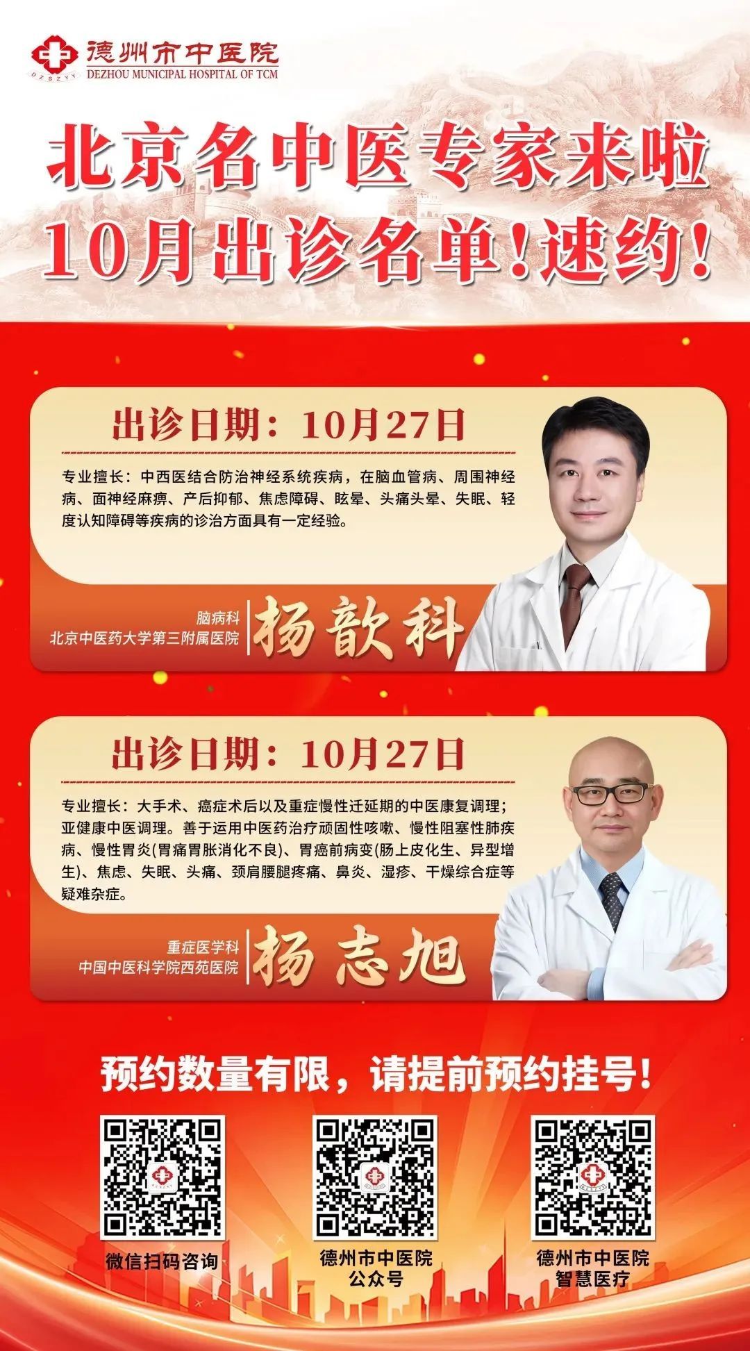 10月27日,北京中医药大学第三附属医院脑病科杨歆科、中国中医科学院西苑医院重症医学科杨志旭到德州市中医院坐诊。