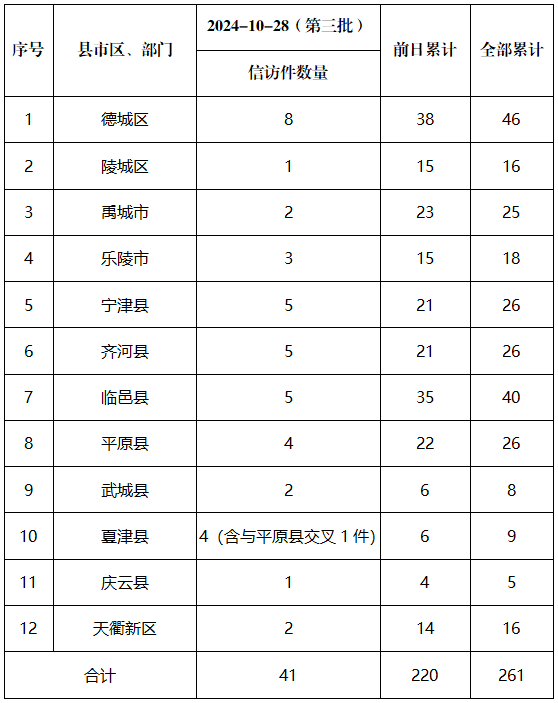 10月28日,山东省第六生态环境保护督察组向我市移交第三批信访举报件共41件,涉及12个县市区,德城区8件、临邑县5件、宁津县5件、齐河县5件、乐陵市3件、平原县4件、夏津县4件(含与平原交叉1件,不计总数)、禹城市2件、天衢新区2件、武城县2件、陵城区1件、庆云县1件。涉及环境问题36个,其中大气污染问题20个,水污染问题11个,土壤问题1个,噪声污染问题1个,固体废物问题2个,生态类问题1个,其它问题5个。上述交办事项,已按时限及要求转交相关县市区政府查处。