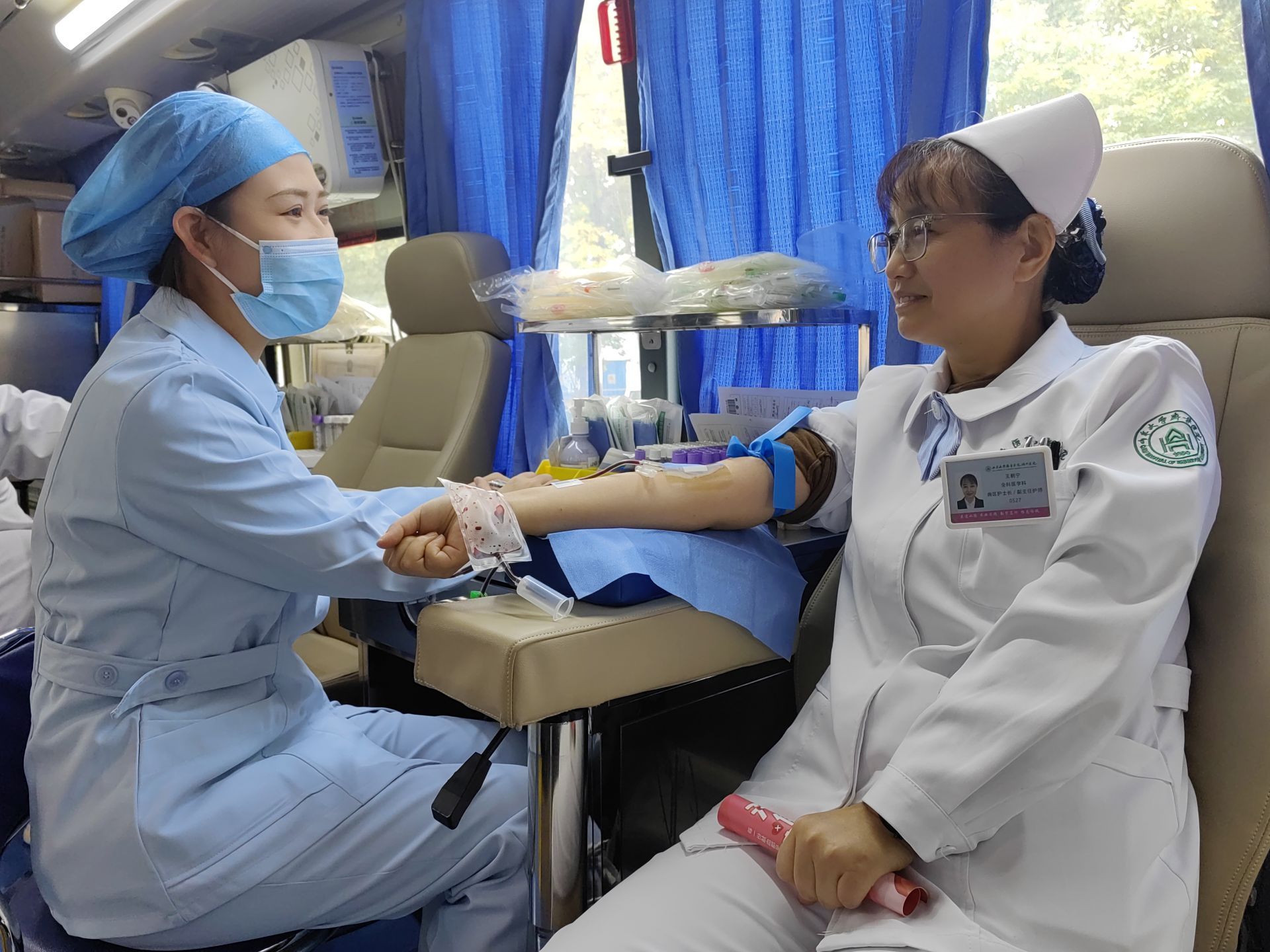 在现场,除了临床一线的医护人员,还有不少行政人员和后勤人员也积极参与。财务科的毛然然和郝静静在献血后,对着镜头比出了一个“胜利”的手势,她们的脸上洋溢着骄傲和满足:“希望我们的血液能帮助到需要的人,让他们感受到温暖和希望。”