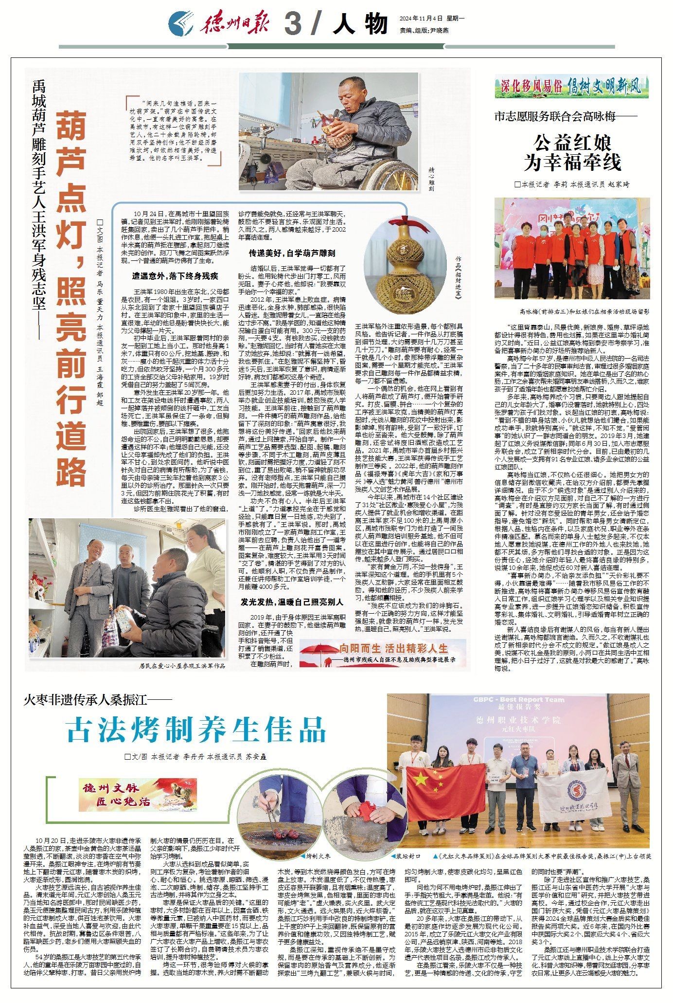 一个偶然的机会,他在网上看到有人将葫芦做成了葫芦灯,便开始着手研究。打皮、留膜、拼合……一个个复杂的工序被王洪军攻克,当精美的葫芦灯亮起时,光线从雕刻的花纹中投射出来,影影绰绰,别有韵味,受到了一致好评,订单也纷至沓来。他大受鼓舞,除了葫芦雕刻,还尝试将废旧酒瓶改造成工艺品。2021年,禹城市举办首届乡村振兴技艺技能大赛,王洪军获得传统手工艺制作三等奖。2022年,他的葫芦雕刻作品《福禄寿喜》《虎年大吉》《家和万事兴》等入选“魅力黄河善行德州”德州市残疾人文创艺术作品展。