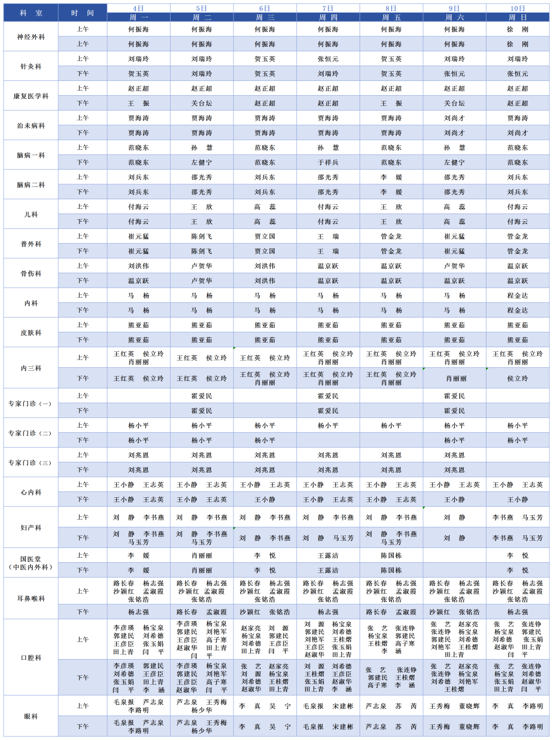 点击德州联合医院微信公众号主页下方菜单“院内服务”——“医生坐诊表”,即可查询当周专家门诊排班表,或微信公众号回复“坐诊表"也可直接获得。