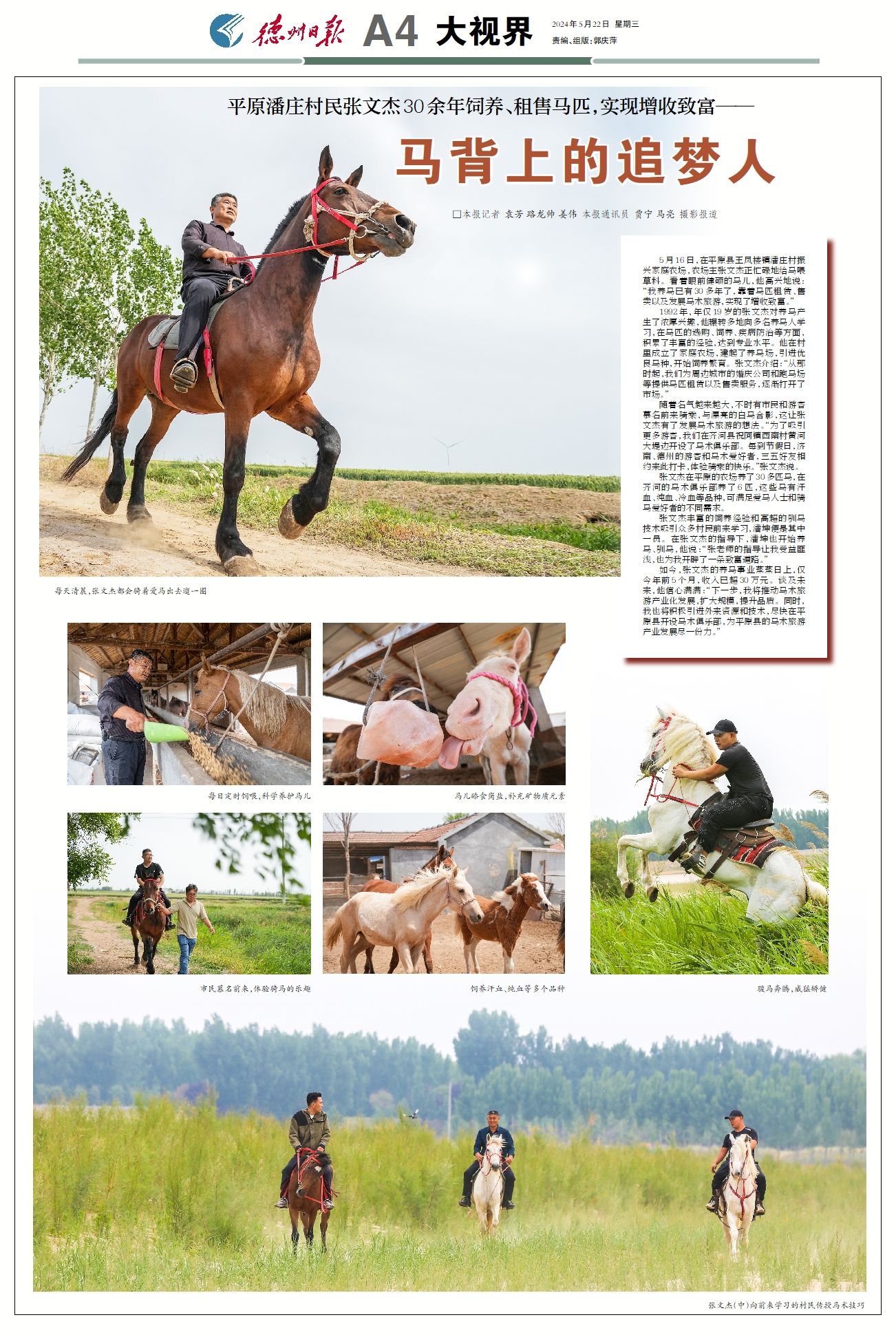 如今,张文杰的养马事业蒸蒸日上,仅今年前5个月,收入已超30万元。谈及未来,他信心满满:“下一步,我将推动马术旅游产业化发展,扩大规模,提升品质。同时,我也将积极引进外来资源和技术,尽快在平原县开设马术俱乐部,为平原县的马术旅游产业发展尽一份力。”