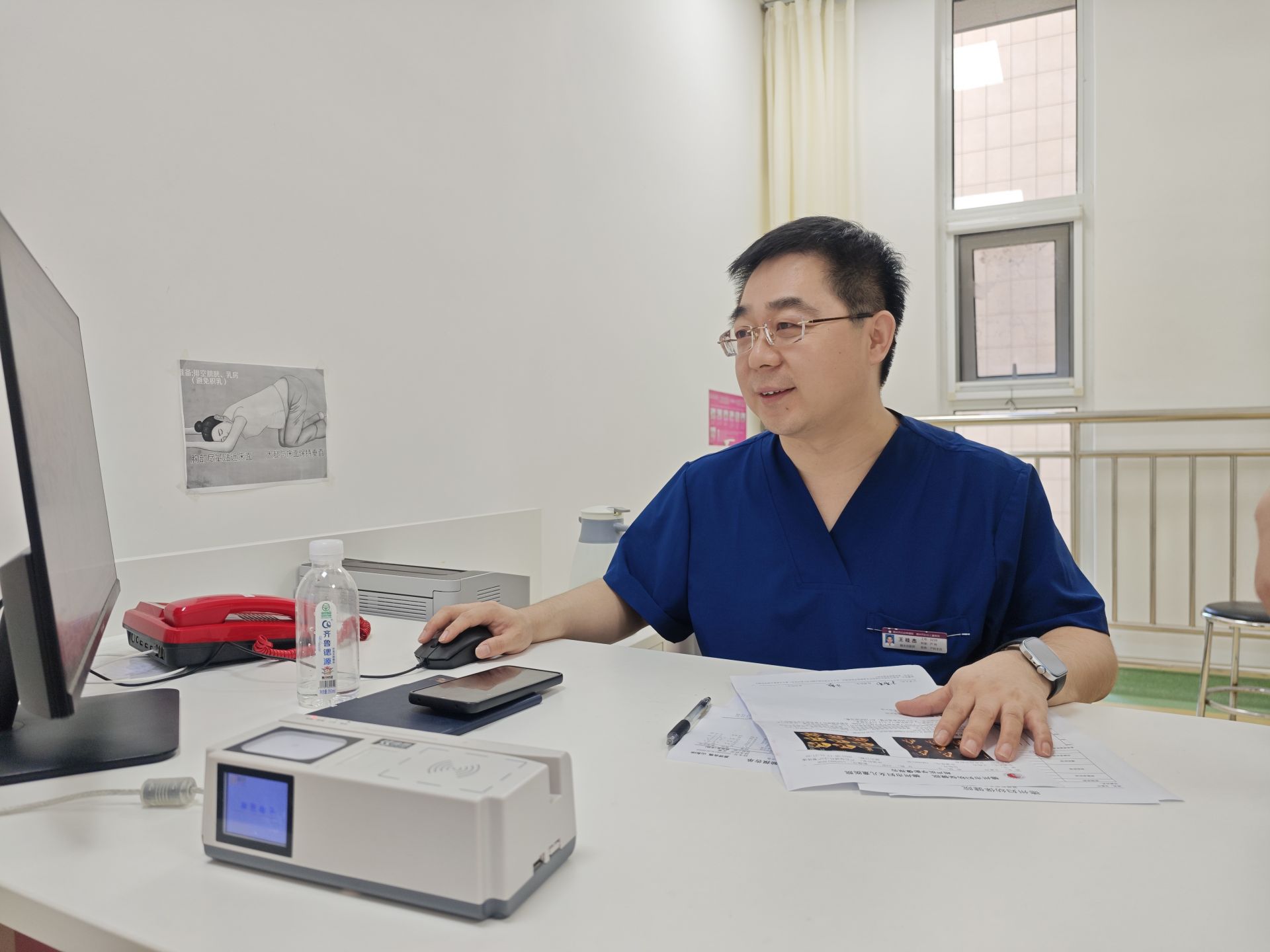 8月18日早上8点,德州市妇幼保健院东院区产科门诊,楼道里开始有孕妇排队等候。产科主任王桂杰早已在诊室,桌上晾着冒着热气的两杯水。一上午,他沉稳平和地与孕妇们交流。结束时,孕妇的水杯换了几轮,他那杯水早已凉透,却仍是满的。