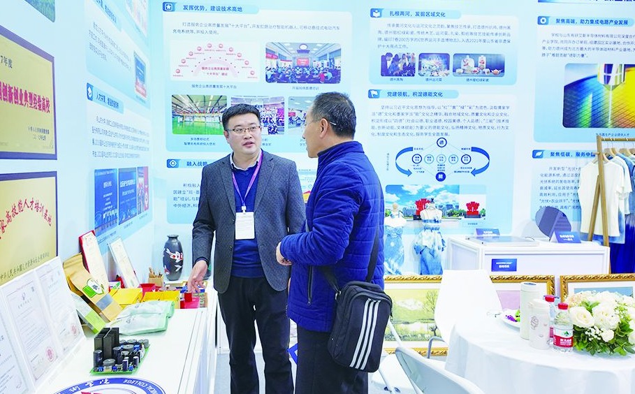 在2024年世界职业教育发展大会上,高强(左)向来宾介绍自主研发产品