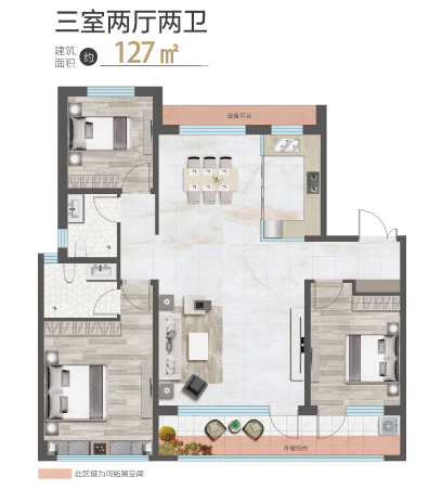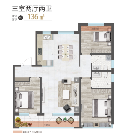 此次加推的洋房为一梯两户配置,主推127平方米、136平方米三室两厅两卫户型,在空间设计上颇具亮点。户型拥有约11.4米的南向三面宽,搭配约4.8米的奢阔横厅以及约7.8 米的宽幕观景阳台。三面宽朝南、双卧朝阳的设计,让户型全明通透,进深短,能引入充足光线,还能让清风在室内流通。阳台采用落地窗设计,不仅扩大了采光范围,还能将小区园林景色融入日常生活,业主在这里可以养花、品茶、读书,感受四季变化。