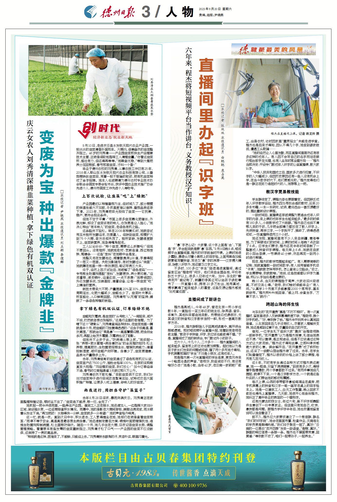 毕业于德州农校的刘秀清,从事农技工作已有25年,2018年入职山东水发航天现代农业科技有限公司,从番茄棚转战韭菜田,凭着一股不服输的韧劲,把有机韭菜种成了金字招牌。她本人也被聘请为德州农村专业技术协会联合会蔬菜专委会秘书长,获评中国农业技术推广协会先进个人、德州市蔬菜工作先进个人等称号。