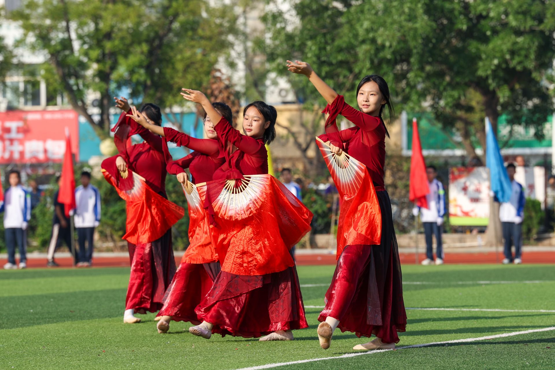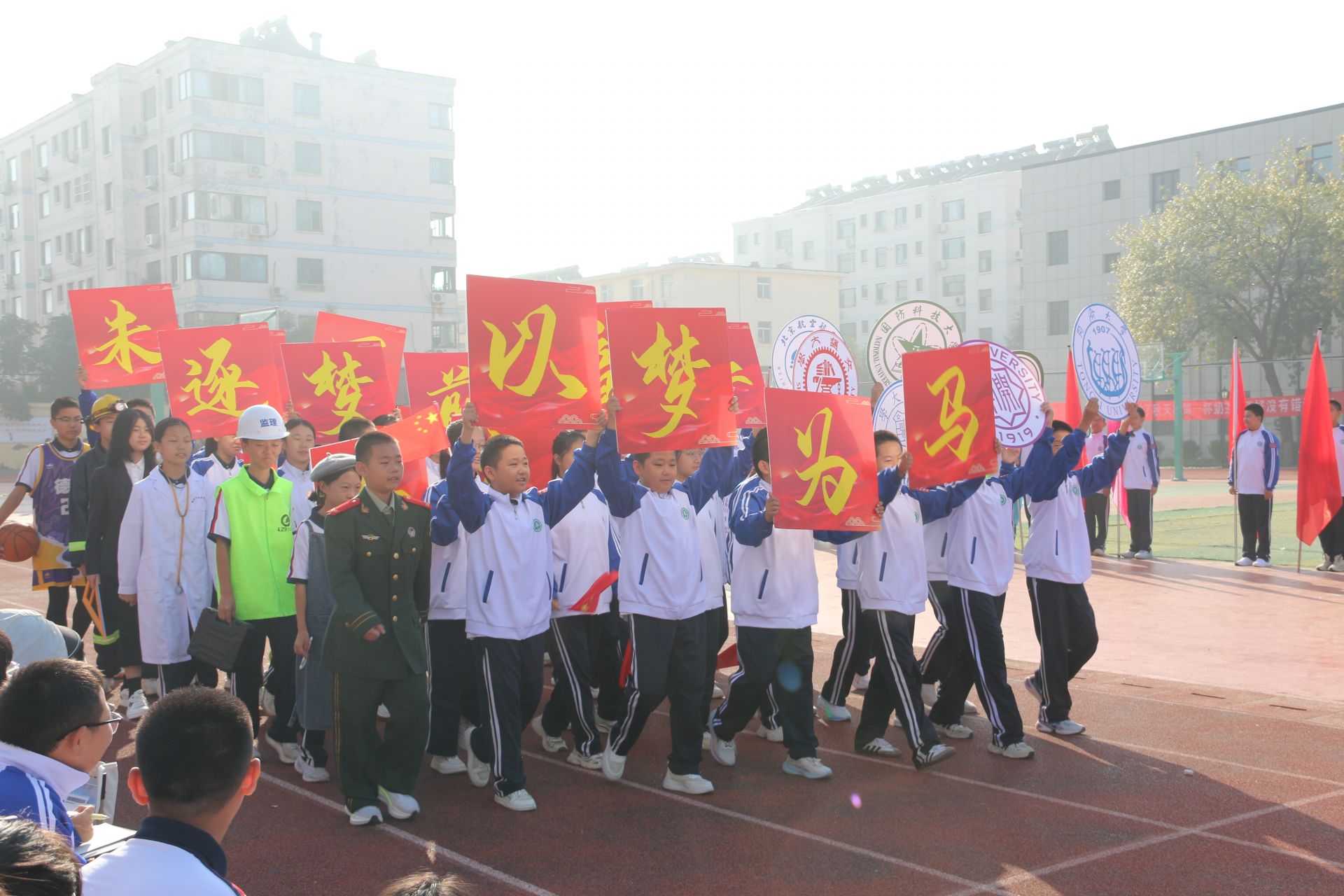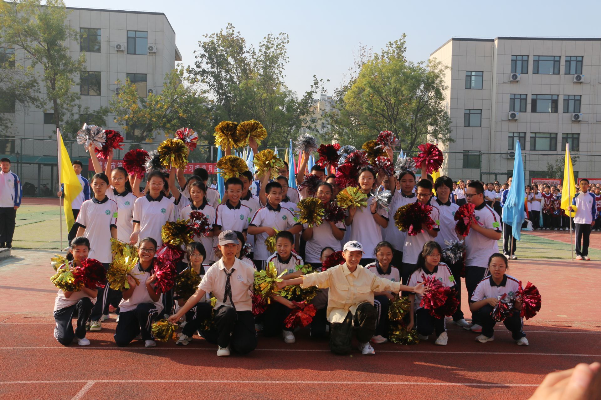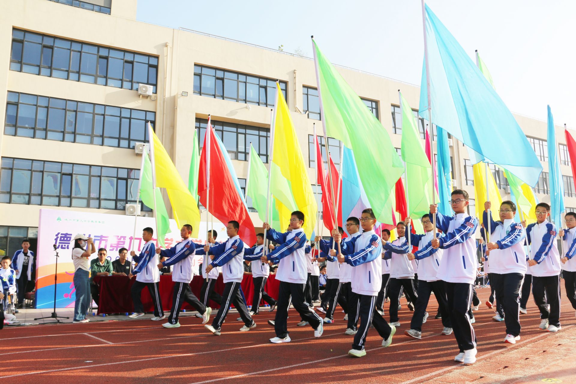 上午8点,开幕式在激昂的《运动员进行曲》中正式拉开帷幕。国旗方队、彩旗方队、班旗方队以及特色方队依次有序入场,他们步伐矫健,口号嘹亮,充分展现了九中学子朝气蓬勃、昂扬向上的精神风貌。