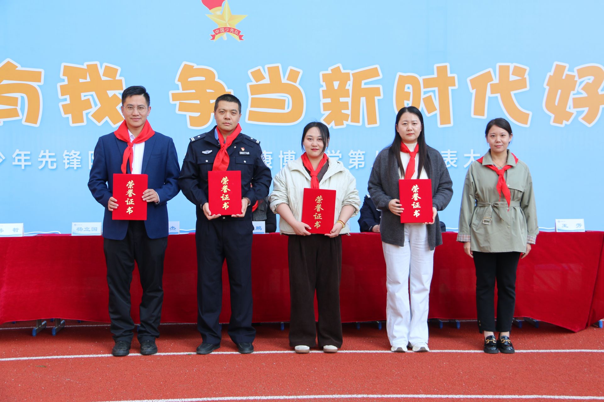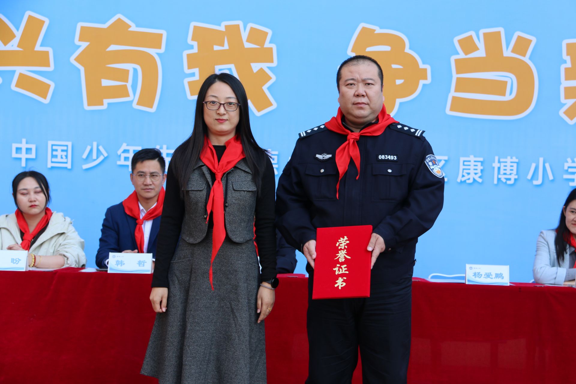 学校并向校外法制副校长、校外辅导员颁发聘书。新一届大队委员会成员在大会上接受了肩章,肩负起新的使命与责任。