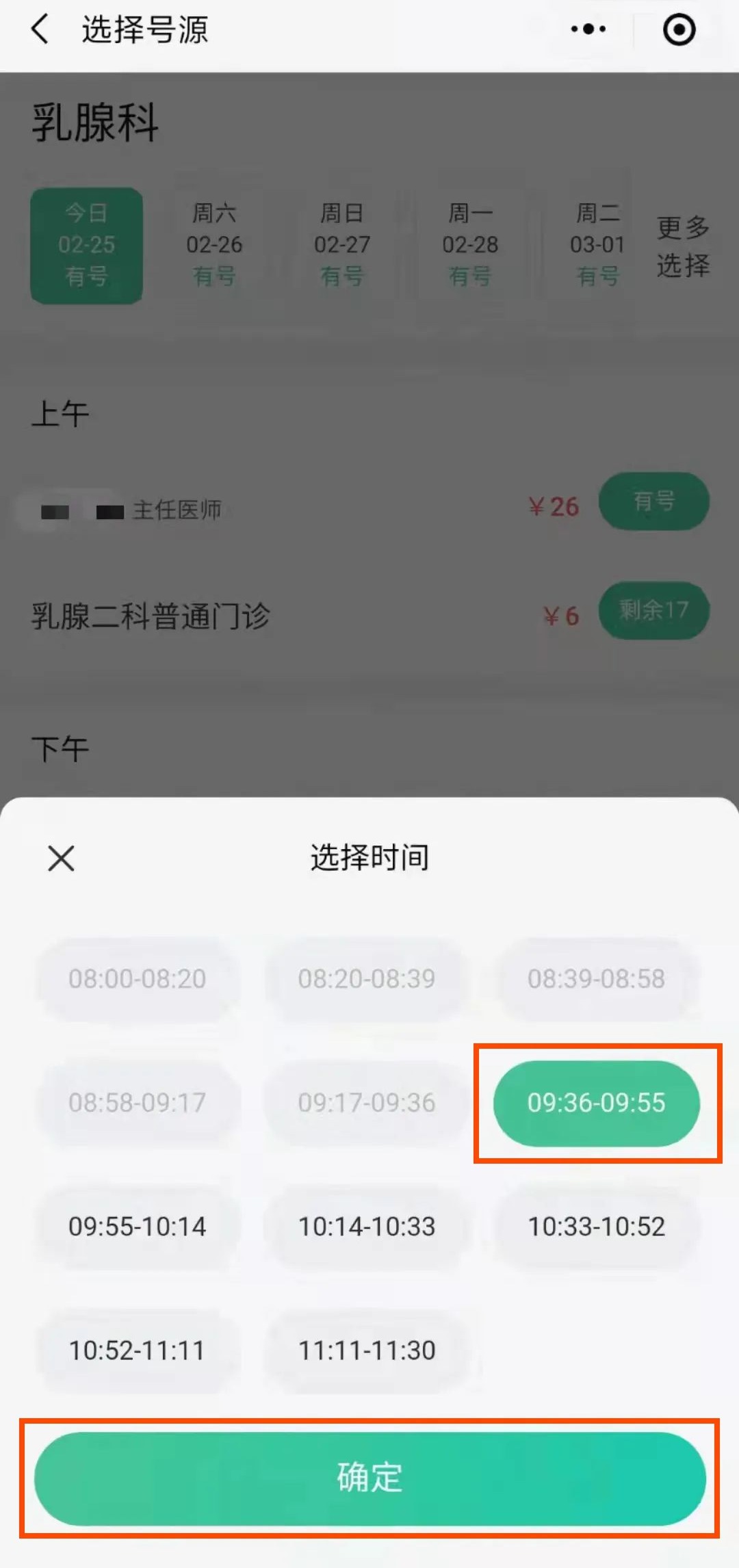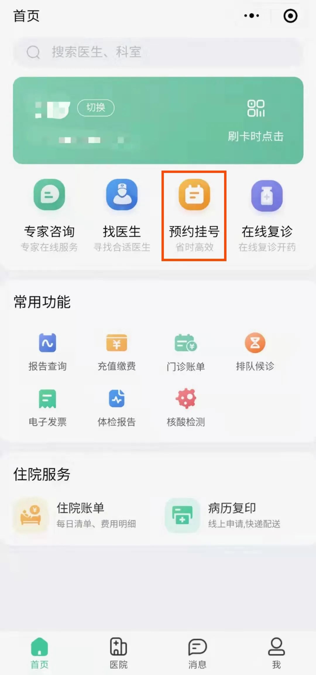 步骤2:在首页选择预约挂号→选择需要挂号的科室进行预约挂号→选择挂号号别→选择就诊时间→选择就诊人确认挂号。