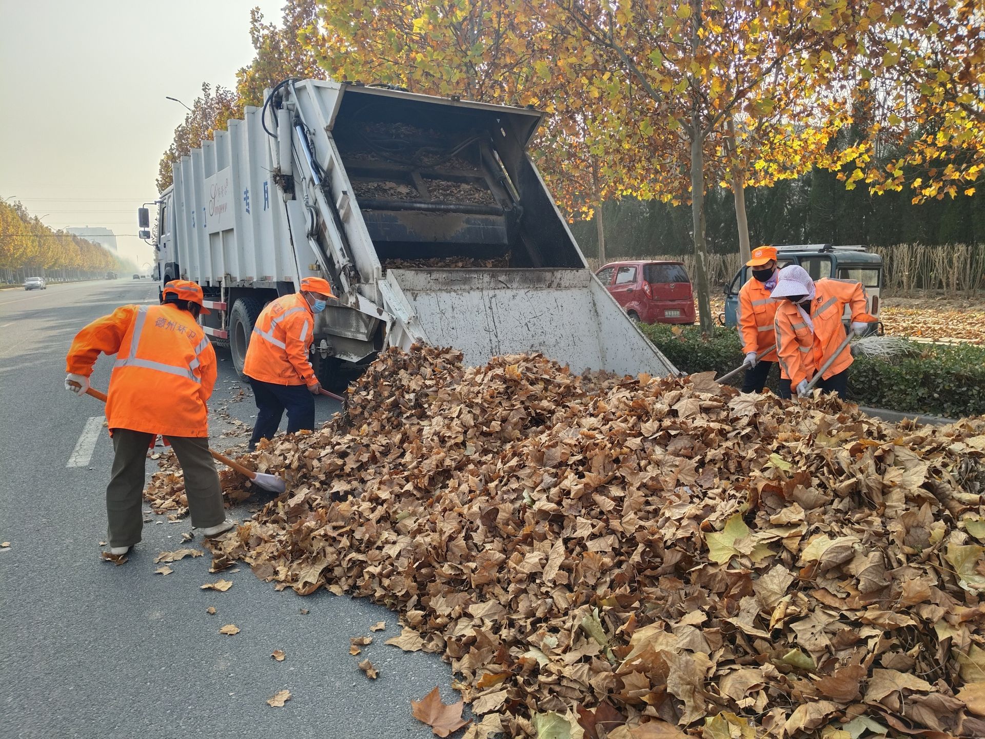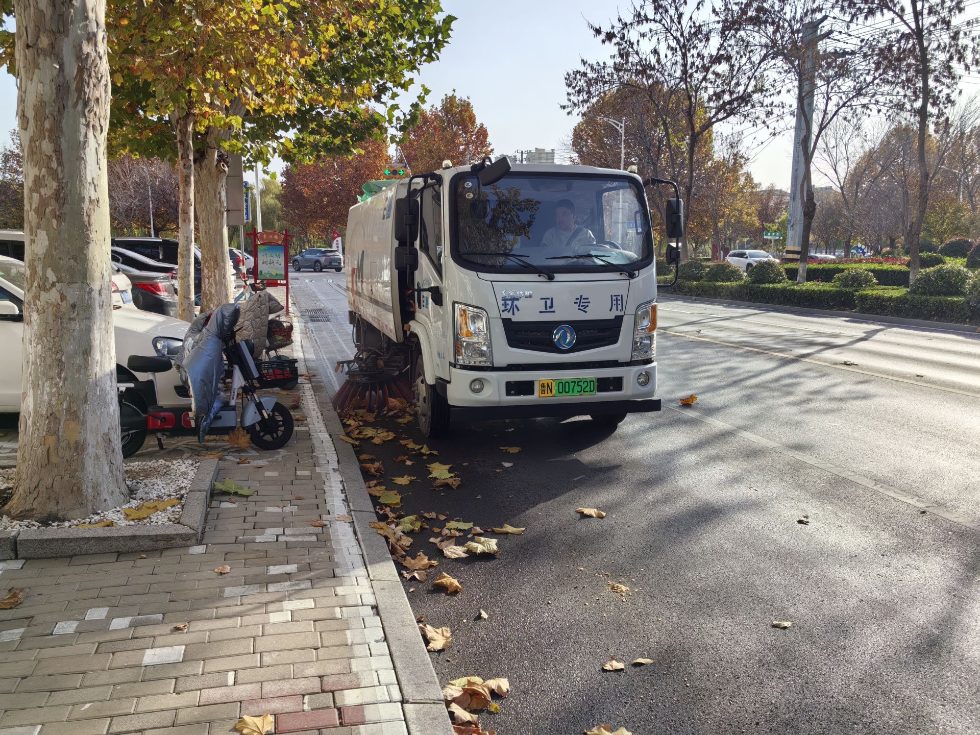 环卫中心统筹调配人力、机械资源,制定“清扫—收集—转运—处置”全链条作业方案,保洁员全员上岗,配备洗扫车、高压冲洗车、落叶收集车等专业设备,采用“机械作业+人工攻坚+机动收运”协同作业模式,明确职责分工、作业频次和衔接流程,确保落叶清理“不打乱仗、不留空档”,实现高效闭环处置。